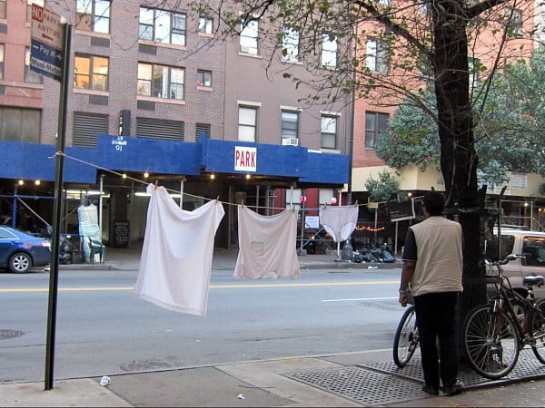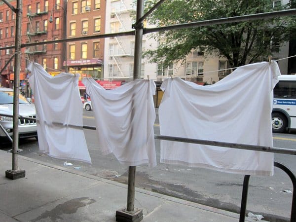 I wish I had caught the performance component, but I did see the results of Lois Weaver and Lori E. Seid‘s “Commit an Act of Domestic Terrorism,” where laundry was hung to dry along the streets. The laundry was meant to reflect the ritual shared around the world, traditionally by women, of drying laundry in odd places.