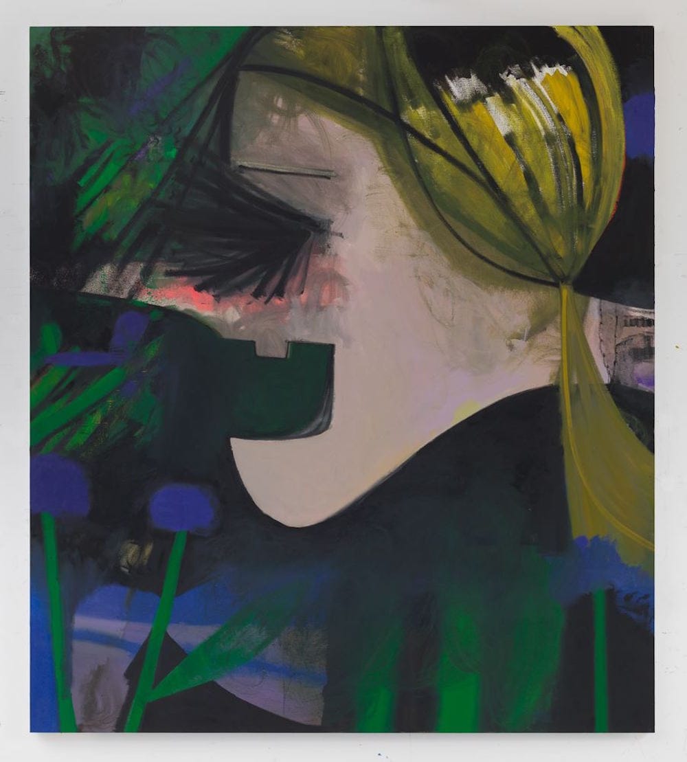Another artist whose work I have long been interested in, but I have not written about until now, is Ellen Berkenblit, whose painting, “Night Vibe” (2015) is in Subliminal Shifts at Tracy Williams. Will someone please give Berkenblit a museum show already? At the very least, her work is as interesting — if not more so — as some of what her better-known peers are known for. “Night Vibe” has the well-known Berkenblit profile — a flat shape with a pointy nose, an open-mouth sporting a single, tombstone-like tooth, and dirty-blonde hair tied into a pigtail — stretching from one side of the painting to almost the other. Black, bristle-like lines, denoting lashes, fan out from her eye socket, completely enveloping the eye. I think it is very hard to reuse a cartoony image and continue to hold the viewer’s attention. Berkenblit is the rare exception. The painting inhabits at least two perceptual zones: nightmare and fantasy. There is nothing ironic about it.