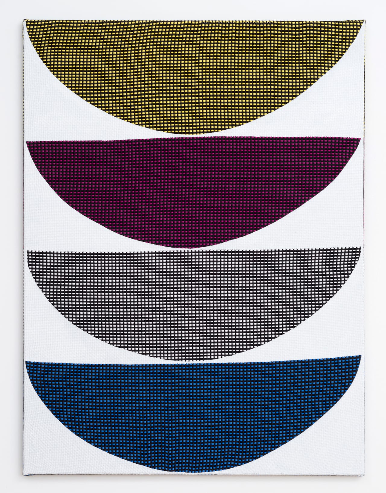 If you see lots of work by different artists, you are going to make your own connections; you will like some things more than others — a situation that is always subject to change — and be tempted to theorize the entire experience. I didn’t know the work of Haley Joseph at Thomas Erben, Clare Grill at Steven Harvey, or Samantha Bittman at Tracy Williams, and I am now looking forward to seeing more by each of them. Samantha Bittman paints on patterned cloth that she weaves on a loom. As she told Deborah Shapiro on the website Sight Unseen, “in my work the graphics and the images are made up of an accumulation of parts and you can always see the totality and the parts at the same time.” Intricately woven, her surface is physical and optical; this is what Bittman applies acrylic paint to, usually making precise shapes that partially cover the pattern while bringing a new configuration into play. The process is painstaking and necessary. And yet, by partially obliterating the pattern, Bittman demonstrates that she isn’t precious, that she is after something more.