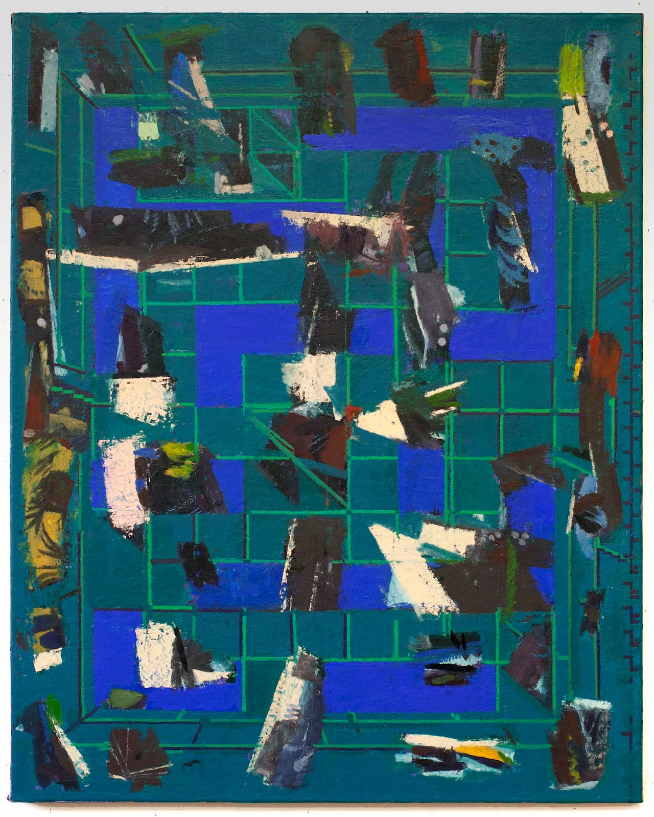 The three artists in this exhibition all make paintings that engage abstract or abstracted forms on the armature of an implied grid. However, these forms and shapes are simultaneously allowed to fall away from any such structure. This “on-grid / off-grid” tension permeates the work of all three painters.