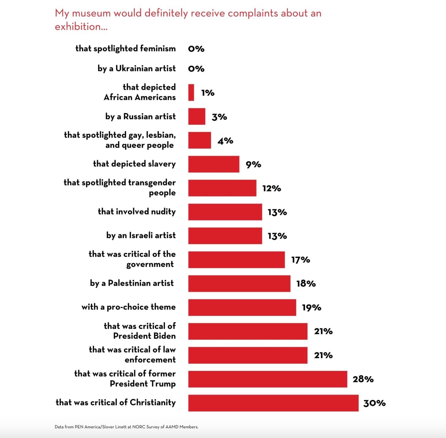 Works by Palestinian artists, works with pro-choice themes, art critical of Biden or Trump or law enforcement, and artworks critical of Christianity are likely to elicit the most complaints among a variety of options the survey asked respondents to consider. As illustrated by a chart in the survey, also reproduced below, 18% percent of respondents said their museum would receive complaints over exhibiting Palestinian artists, regardless of whether they were vocally pro-Palestine, while 13% reported the same if they exhibited Israeli artists.