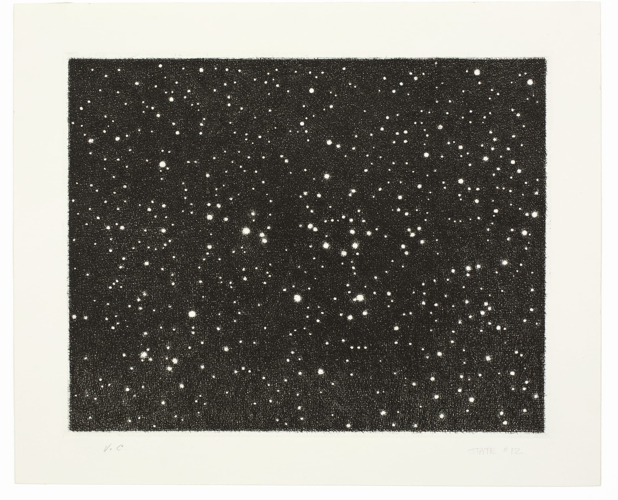 Some works revel in minute details, including a fascinating series from Vija Celmins. Her “Untitled Galaxy” (1986, printed by Doris Simmelink) is an etching over nine working states. It begins as a grid of meticulous lines from which blank spots emerge as stars in later states, and the build up of cross-hatched lines converge to form a deep field of darkness, creating a compelling, high-depth portrait of the night sky. It’s a painstaking process, which builds up to something unexpected and awe-inspiring, as with many of the works in the show. The workshop has provided not only a unique historical record of work from a roster of amazing artists, but a demonstration of the power of collaboration and craft.