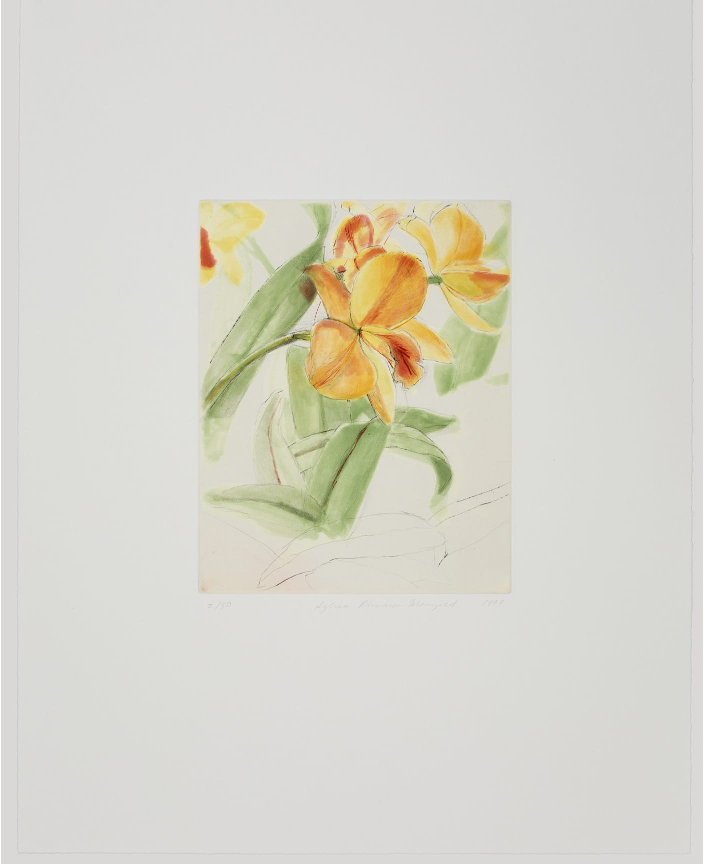 Allen’s intentions come through in her presentation of finished works as well as test prints, proofs, and plates pulled from the college’s archives, to reconstruct the creative process. Accompanying Jessica Stockholder’s collagraph “Skein” (2008, printed with Liz Chalfin) — a swirl of colors in various depths and patterns — is the copper plate used to create the image. Another process-oriented piece is Sylvia Plimack Mangold’s “Hazel Boyd Eureka” (1997, printed by Carol Weaver), a drypoint of a particularly ornate orchid and its leaves, represented in different states of completion.