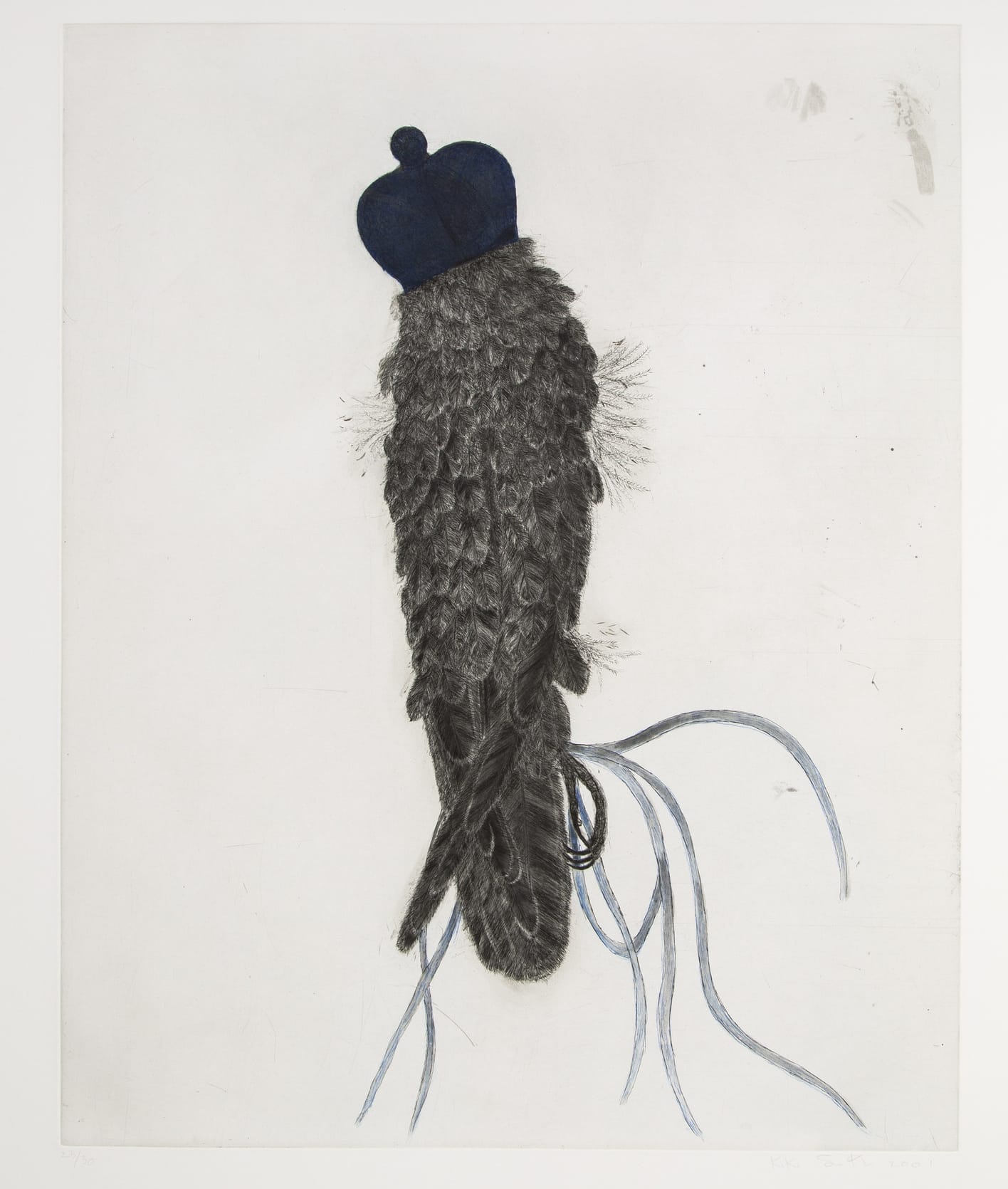 The works, from different points in the printmaking process, showcase the experimentation and creativity that lead to the final product. Kiki Smith’s “Falcon” (1999, printed by Carol Weaver) is a color etching and aquatint of an impossibly detailed falcon with a hood on its head; seen from the back, the individual barbs and color gradations on each feather are painstakingly rendered.
