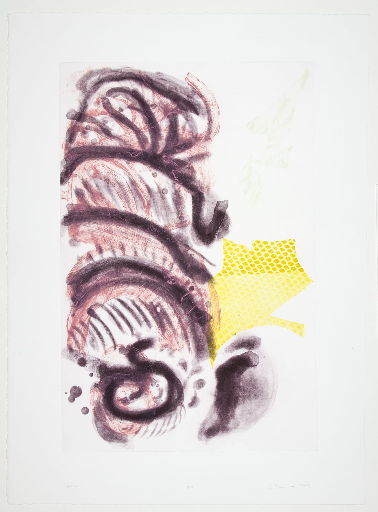 Each print was produced at the Mount Holyoke College Printmaking Workshop, an intermittent series of artist residencies that ran from 1984 to 2012 and was organized by printmaker and professor of studio arts Nancy Campbell. Its purpose was to bring successful women artists to the western Massachusetts campus to shed light on how printmaking works. Over the years it yielded a remarkable collection of lithographs, etchings, serigraphs, collagraphs, and at least one photogravure.