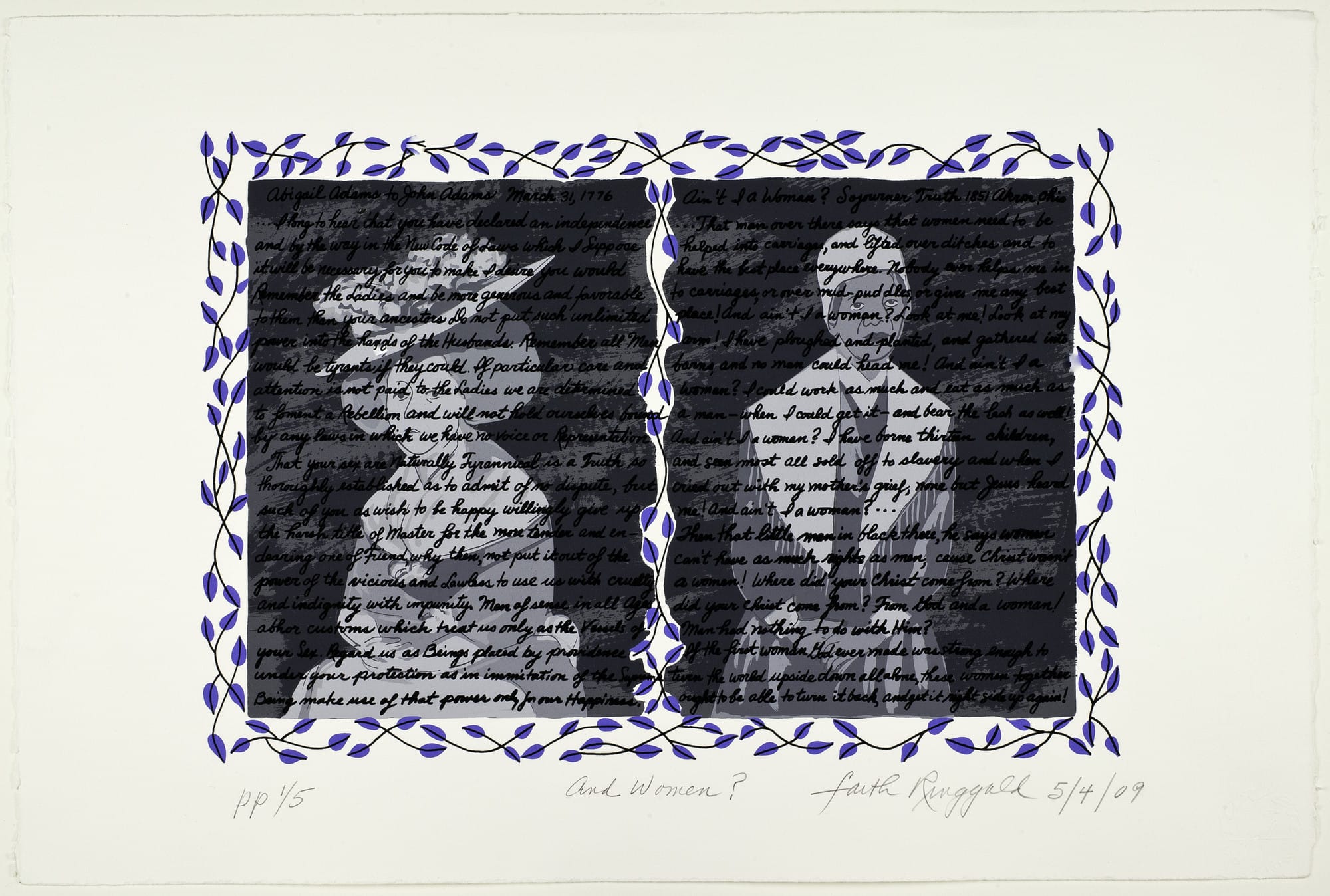 Because it can be widely reproduced, printmaking is an ideal medium for political and social content, and a few works engage with issues that remain timely today. A serigraph by Faith Ringgold called “And Women?” (2009, printed by Curlee Raven Holton) juxtaposes portraits of Abigail Adams and Sojourner Truth, overlaid with their words about women’s rights from Adams’s letter to her husband and Truth’s legendary 1851 speech “Ain’t I a Woman.”