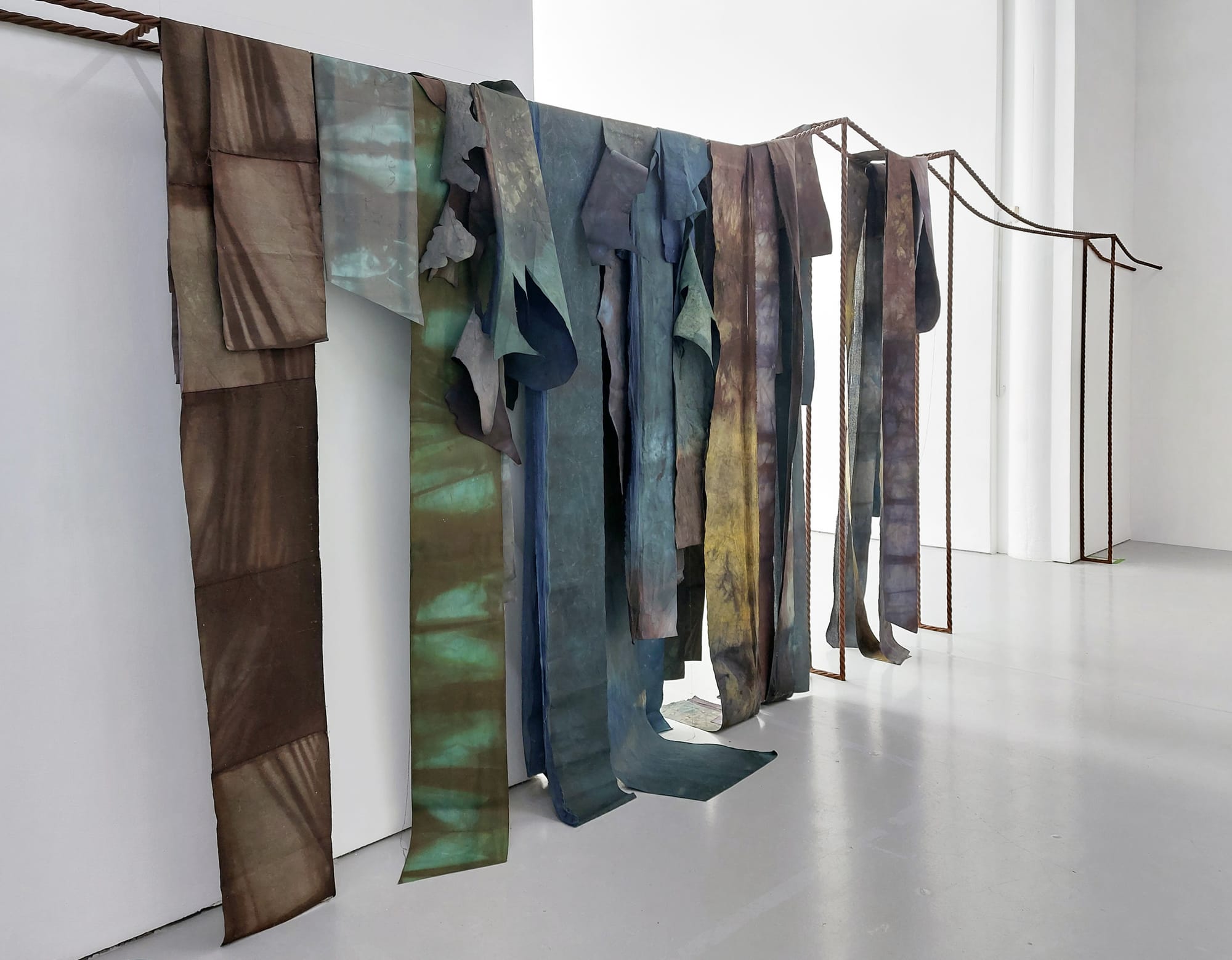 Across Jaouda’s practice, each piece is crafted in part from the offcuts of previous works, forging a creative continuum and a sense of cyclicality, transience, and endurance — the same stuff of collective memory. The boundary between studio and exhibition space is made hazy by her feedback loops, such as her decision to hang remnant fabric from metal armatures to create a sort of screen at the gallery’s entrance. In doing so, she turns it into a threshold where history, memory, and landscape are made, mourned, and ever-returning.