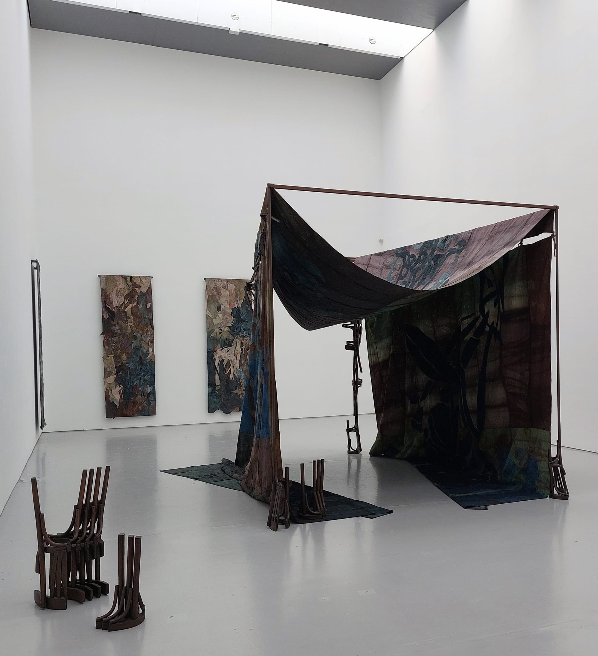 An intimate space conceived as a site of memorial, “The iris grows on both sides of the fence” (2025) was produced in collaboration with craftspeople from Chariah-el-Khayamia, Cairo’s historic street of tent makers, who are often commissioned to create temporary “third spaces” during festivals and gatherings. The introductory wall text positions the tent as an “intimate retreat” where visitors gather to “mourn a landscape that has been uprooted or dispossessed.” With its sides draping onto the floor, Jaouda’s tent forms more of a passageway than a space fit for the durational act of mourning, since there is nowhere to sit and not much space to maneuver around other visitors.
