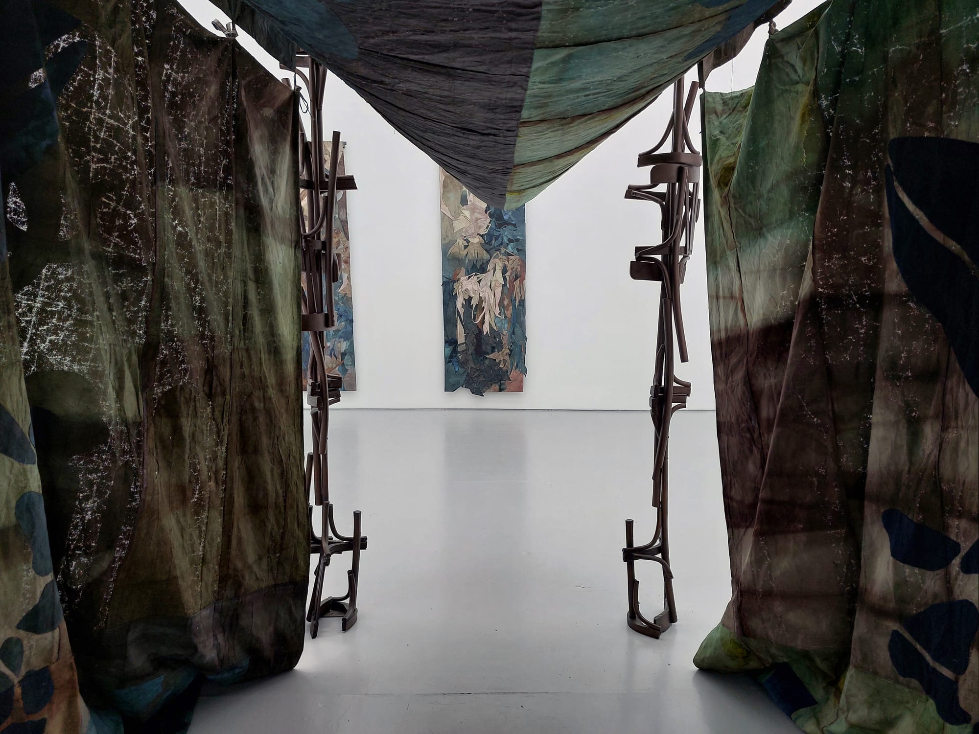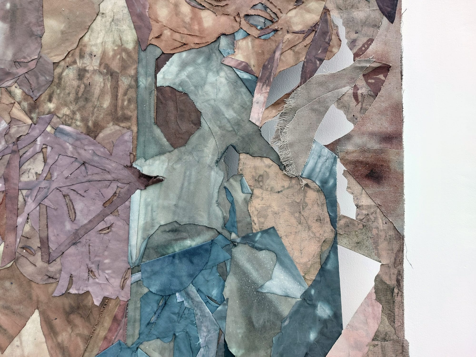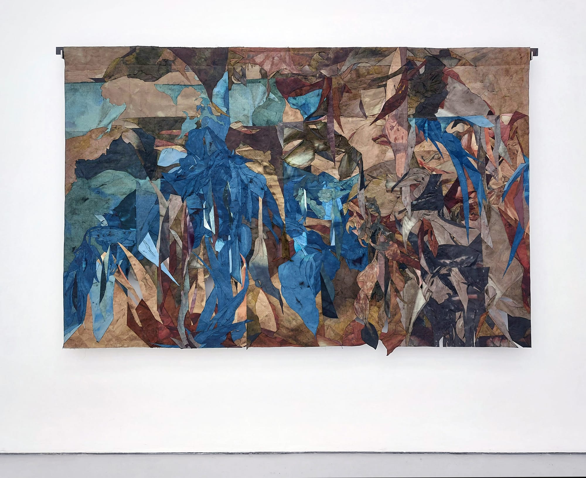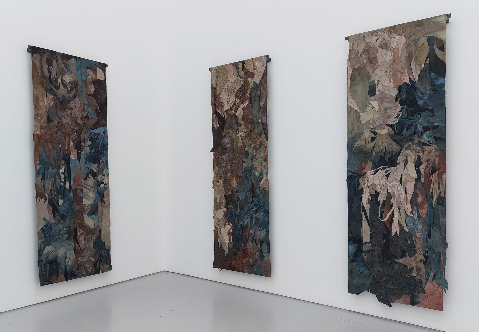 The exhibition also includes a selection of Jaouda’s wall-based works, produced specifically for this show. These pieces are illustrative of her labor-intensive process, in which she hand-dyes fabric with natural pigments before cutting out shapes and re-forming these fragments into tapestry-like assemblages. Suspended a couple of inches from the wall, they contain small gaps and perforations, revealing the complexity of their construction. Rather than being appliquéd onto a pre-made backdrop, they are assembled piece by piece until they form a cohesive whole. The result is a sophisticated form of patchwork that attests to the conditions of its own making as an act of reparation and healing.