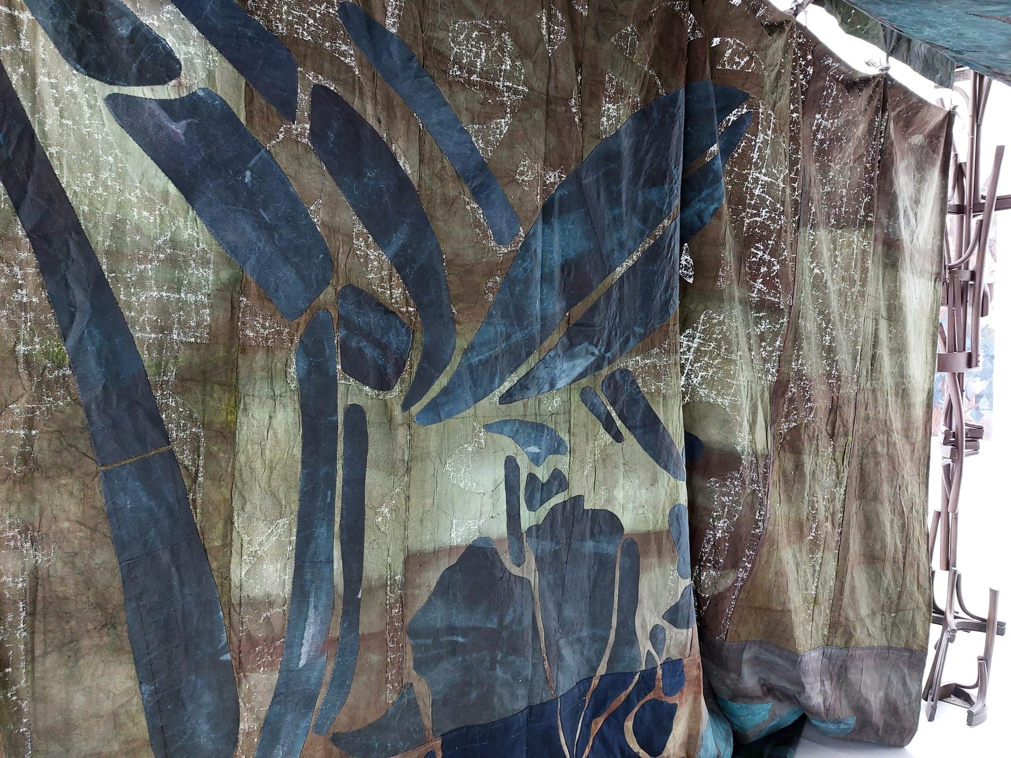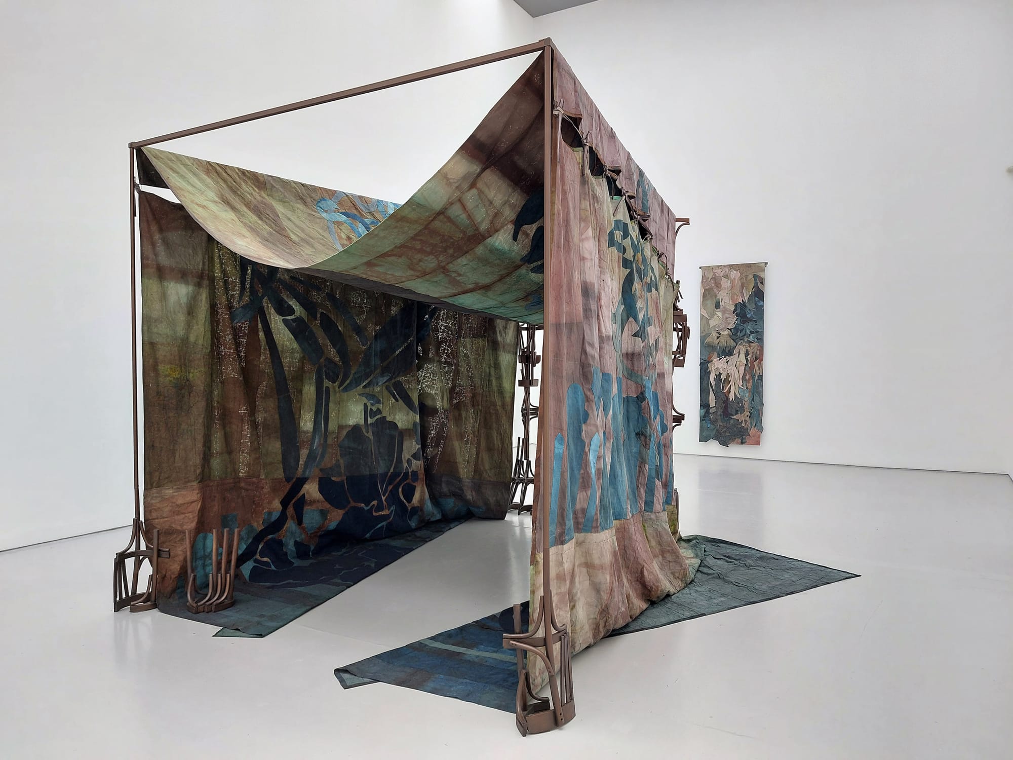 Nevertheless, the idea of an installation as an intimate space to consider lost landscapes comes through powerfully. The tent is decorated with botanical motifs, including a partially abstracted rendering of the purple-petaled Faqqua iris, the national flower of Palestine. An emotive symbol of resistance, resilience, and hope, its presence also invokes the loss of lives, cultural heritage, and ecological diversity caused by Israel’s war and genocide in Gaza. There is something topographical about Jaouda’s textured textiles; the layering of earthy-colored panels suggests that land is a vulnerable yet enduring container for cultural memory.