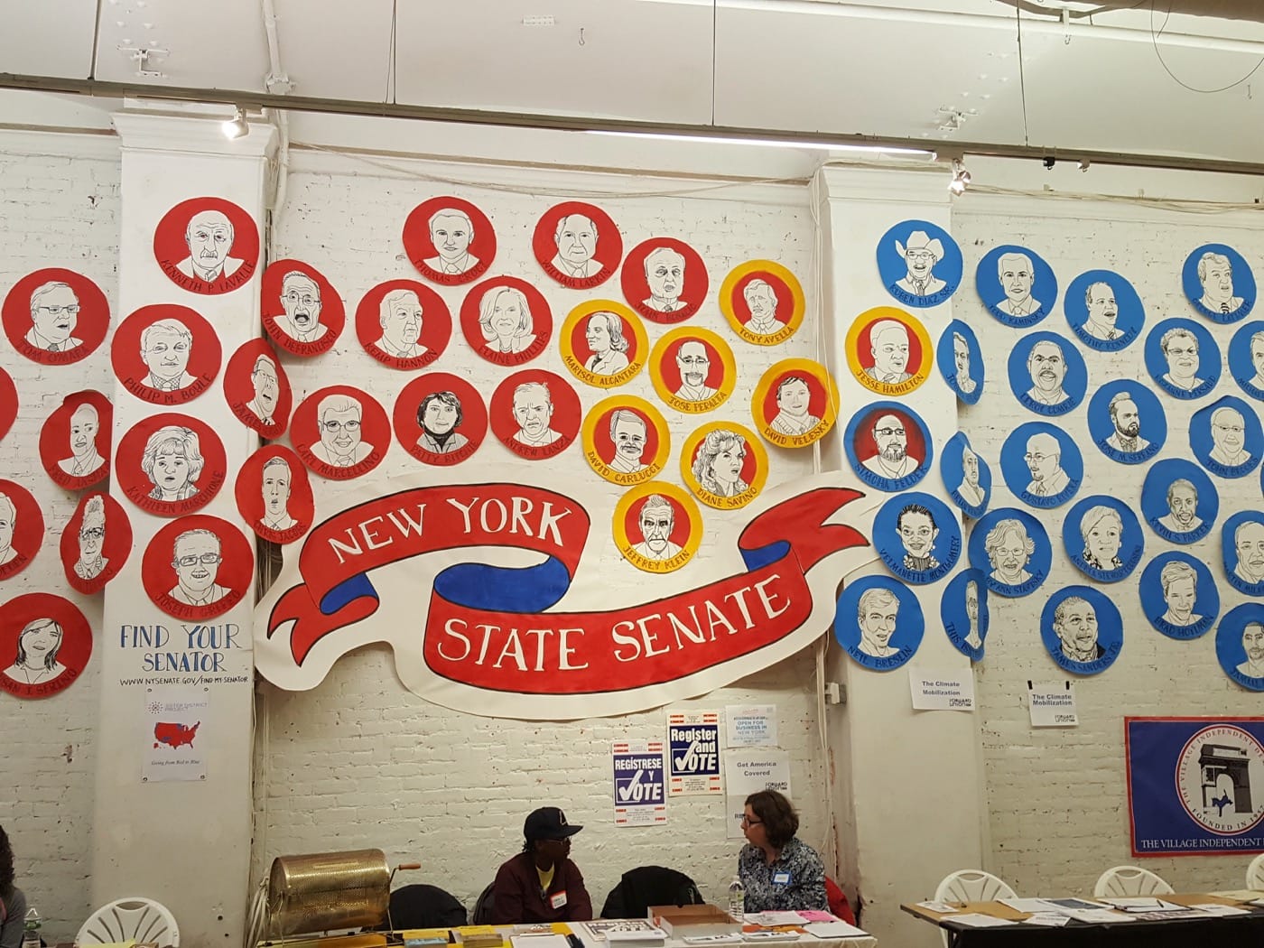 On the main floor, in the room where most of the organizations had their tables, a kind of collaged mural made by van Beek was installed. “New York State Senate” (2017), the most politically pointed visual work I saw at the event consisted of a series of drawn likenesses of the members of the senate with the Republicans circled by a red nimbus and the Democrats by blue, while a splinter group of senators who ran as Democrats but caucus and vote with the GOP were depicted against red and yellow backgrounds. The yellow, I assume, refers to their cowardice or treachery.