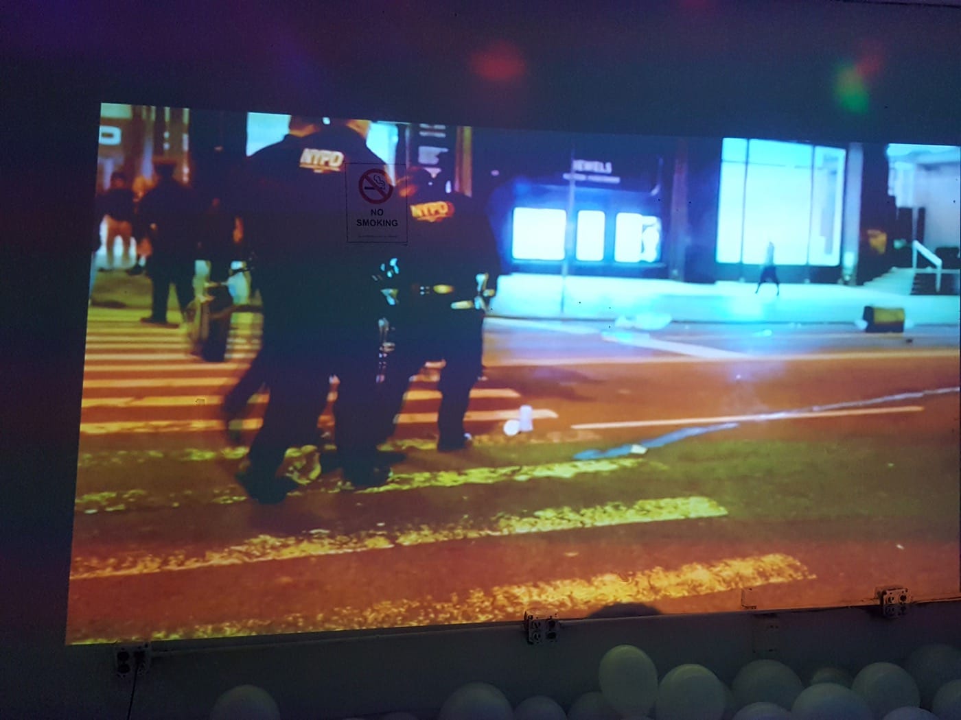 Benavente’s piece was the most fun. It consisted of a room in the venue’s basement with subdued lighting, white balloons covering most of the floor, and a video taking up the majority of one wall. Before going into “I’m Not Dancing; I’m Struggling to Survive” (2017), I was given a pair of headphones. The joyful dance music that came through was the antithesis of what was depicted in the video: police officers walking through a downtown thoroughfare, using a portable loudspeaker to play dissonant and grating sounds amid verbal instructions to clear the street (which came through the headphones at a subdued volume).