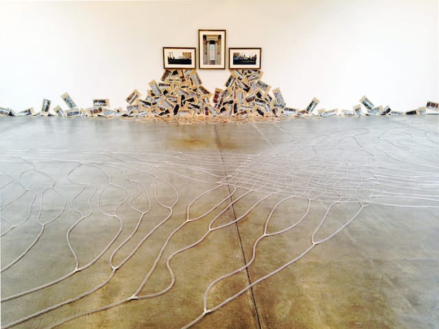 Haacke’s functional-abstract sculpture, “Together,” first made in 1969, covers the floor of the main gallery, with electric motors pumping water through lengths of intersecting plastic tubes. It’s like an X-ray of an underground spring or a large-scale section of the circulatory system — the point being that any and all such associations apply.