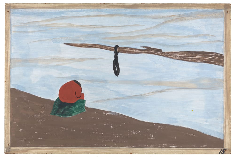 0. An example of this is panel 15 where, within a barren landscape, an empty noose hangs dead center. We see two people: a forlorn, faceless figure (pictured) and the hanged man (in our mind’s eye). Death is both conspicuously absent and overwhelmingly present. Likewise, no sign of tears. But there are tears. Listeners are moved to them by the film footage of Billie Holiday singing “Strange Fruit” in an adjoining gallery. Mesmerizing in its mournful, drawn-out notes and pauses—as much death in the silences as in the sounds—I heard Holiday’s song as I looked at Lawrence’s painting. I pictured the singer walking the same streets that Freddie Gray walked in the Sandtown-Winchester neighborhood of West Baltimore, where both Gray and Holiday were raised, and where Gray’s fatal arrest led to April’s unrest. I thought of the report I recently read, stating that almost 4,000 black men, women, and children were lynched in the south between 1877 and 1950.