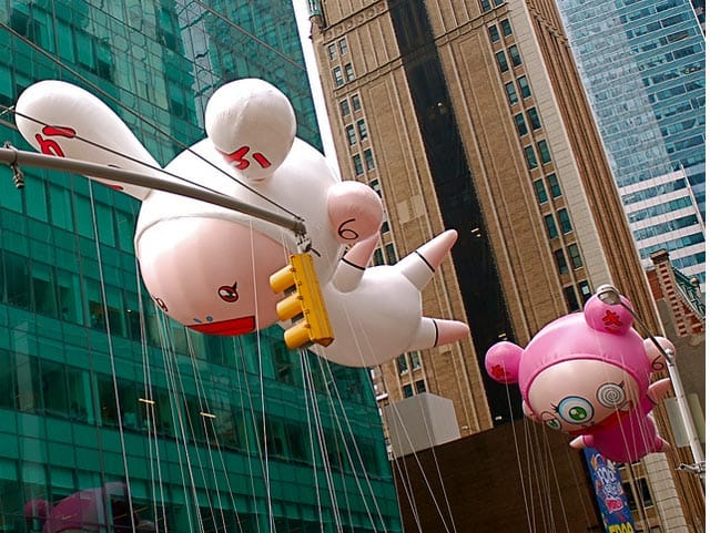 Think contemporary art’s going mainstream? It doesn’t end with Louis Vuitton bags and album covers. Joining the cartoon figures and name-brand mascots at Macy’s Thanksgiving Day Parade were superstar contemporary artist Takashi Murakami’s signature surreal characters, KaiKai and KiKi, two anime critters that share monikers with Murakami’s company.