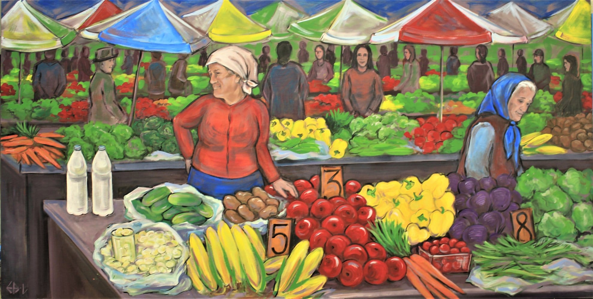 Originally installed in 2017, the murals were created by local artists such as Sky Purdin and Daniel Granados and a youth painting group at the nearby Plains Art Museum as part of a $45,000 grantmaking project from ArtPlace America. The painted wood panels show Black and Brown women selling fruit and depict Earth inside a mandala of world languages to represent the communities that frequent the Plaza, including Syrian, Kurdish, Liberian, Nepalese, Ukrainian, and Mexican immigrants.