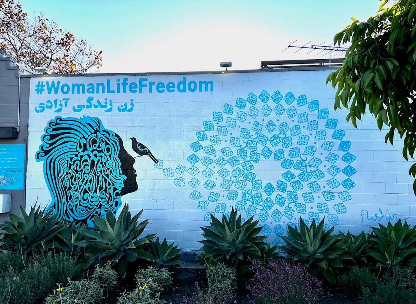 Further West, in Santa Monica, the side of an office building now bears Rashin Kheiriyeh’s mural of a woman’s silhouetted head in profile, her hair rendered in sinuous, turquoise Persian calligraphy. Kheiriyeh created the mural before the death of Amini for a mural competition sponsored by the Farhang Foundation, a nonprofit that supports Iranian art and culture. After Amini's death, Kheiriyeh posted an image of the mural to social media and added the slogan “Women, Life, Freedom.”