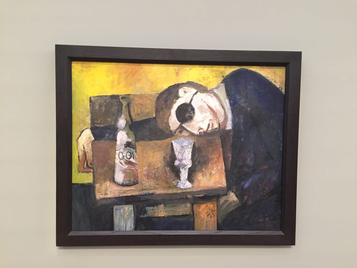 For example, in Harald Metzkes’s “The Drinker” (1955), (a work censored by GDR officials) an inebriated figure is shown slouched over a table painted in a kind of sloppy, no-fucks-given socialist-realist style. The work was obviously not to the satisfaction of GDR officials, whose guidelines for socialist art required depictions of the working class in sweepingly heroic terms. Instead, the subject is a drunkard, an outcast, barely hanging on to the slab of wood beneath him. Metzkes seemed to actively undermine state-sanctioned values by showing a lethargic, intoxicated man — basically the antithesis of state sanctioned masculinity. It felt to me that at its core, Metzkes’s work is also indebted to melancholy, the persistent agony anyone who has suffered from addiction can attest to.