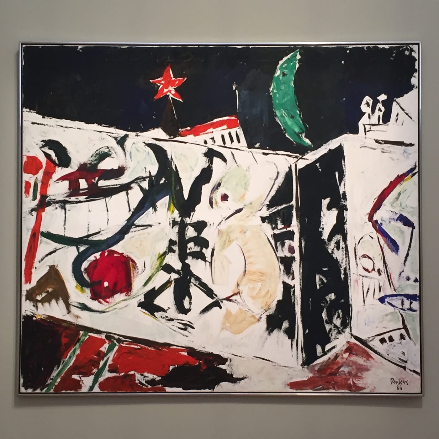 In Stefan Plenkers’s “Strange Signs” (1986), another work censored by GDR party officials, the artist depicts a wall-like frieze inspired by graffiti he encountered on a trip to West Berlin in the late 1980s. While in West Berlin, the artist perceived — likely for the first time in his life — the sense of freedom and openness coming from the expressive potency of art in public space. Plenkers regarded graffiti as a medium for resisting the indoctrinating force of East German censors, likely because he witnessed graffiti speaking of and for the streets.
