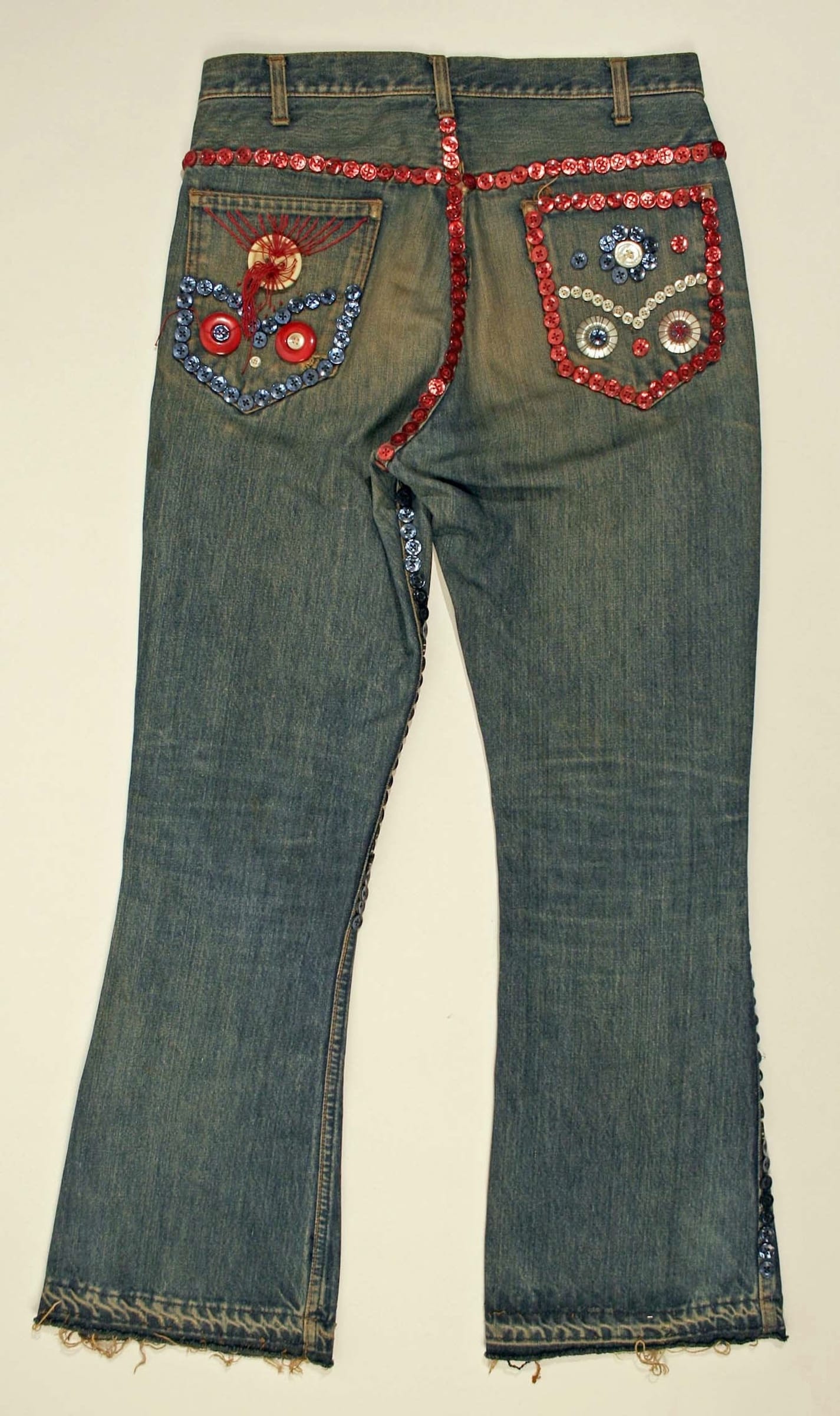 While it may come as a surprise that denim was invented Nîmes, France, blue jeans are an American creation, patented by Levi Strauss & Co. founders Levi Strauss and Jacob David in 1873. The company's own history is entwined with racism on account of its adopting an anti-Chinese labor policy in the 1880s, but blue jeans themselves have transcended beyond the brand, becoming one of the most cherished trousers in both the US and around the world today. Denim diehards can find this pair adorned with red, blue, and silver buttons at the Metropolitan Museum of Art's Costume Institute in New York.