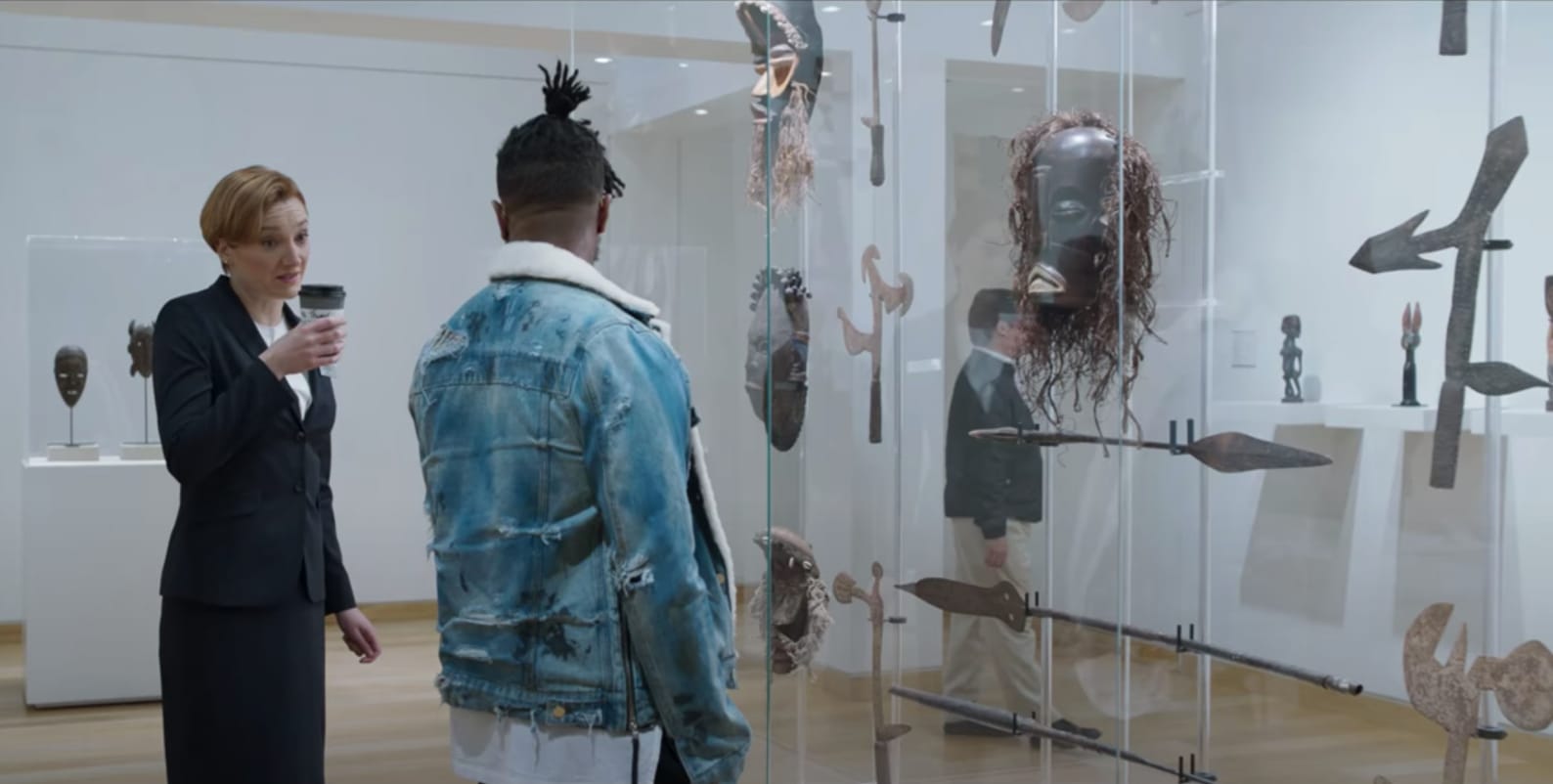 Another example is the famous art heist scene from Black Panther (2018), in which the character Erik “Killmonger” Stevens gazes at a display of West African objects on view at the “Museum of Great Britain,” a thinly disguised cover for the British Museum. When the curator, a thin white woman in a suit taking intermittent sips from a coffee cup, approaches him to share her "expertise," he refutes her knowledge of one of the works' origins.