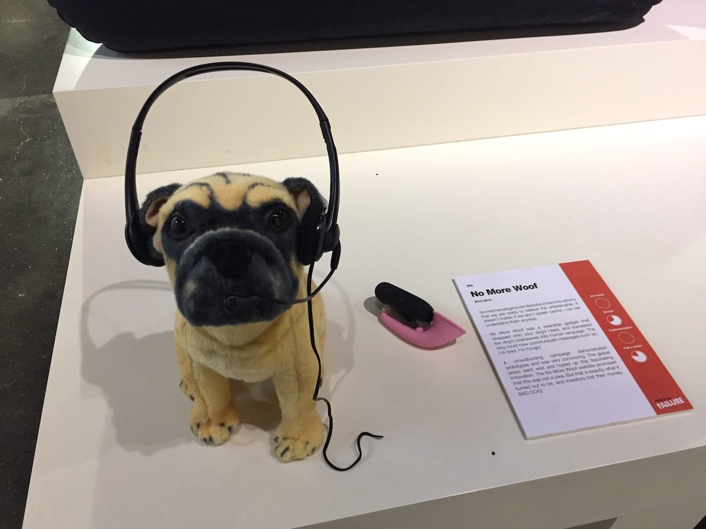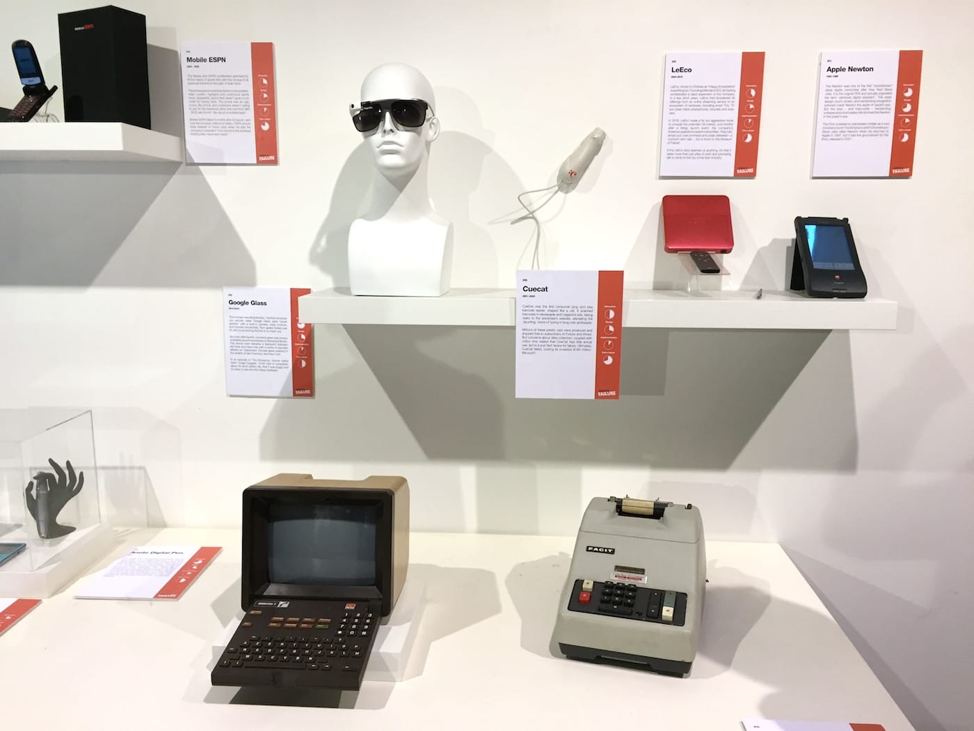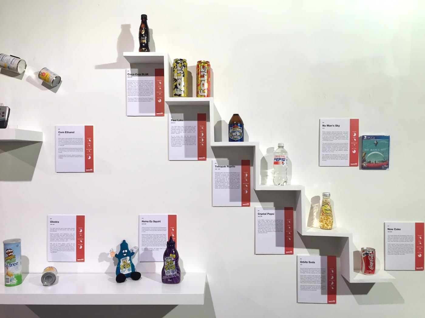 The introductory wall text invites visitors to “Come on in and feel better about the bad decisions you’ve made and find humor in the failures seen ’round the world.” The walls are peppered with inspirational quotes like, “Think like a queen. A queen is not afraid to fail,” from Oprah. Object labels offer little in the way of rigorous analysis or thoughtful context, instead relying on corny dad humor to appeal to patrons. A pseudo-scientific chart on the side of each label purports to rate objects according to “Innovation,” “Design,” and “Implementation,” resulting in a final “Fail-o-Meter” score, with no explanation as to the metrics involved. In essence, the Museum of Failure is a BuzzFeed listicle come to life.