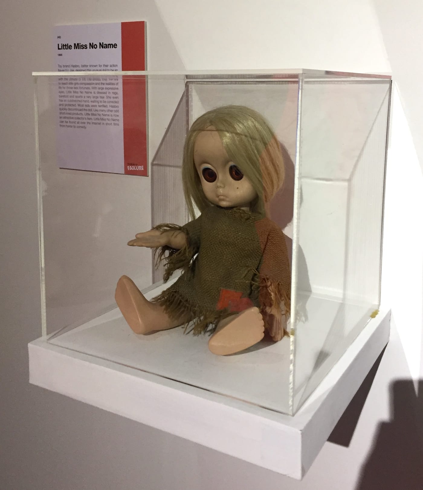 A few quirkier items stand out as well, such as “No More Woof,” a device that supposedly translated dog thoughts into human speech (spoiler alert: it didn’t), or “Little Miss No Name,” a 1965 Hasbro doll dressed in rags, her hand extended in a begging pose, a teardrop spilling out of her enormous eye.