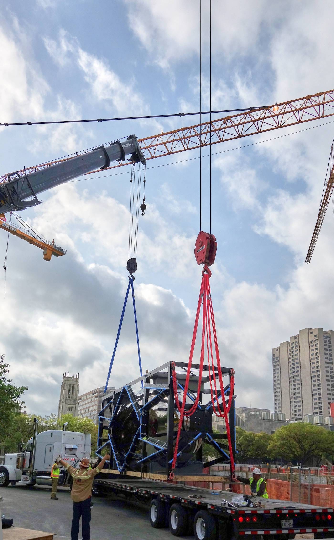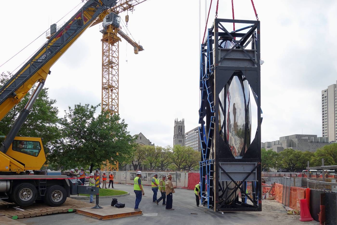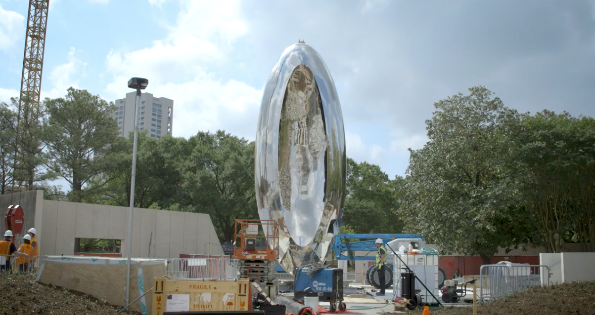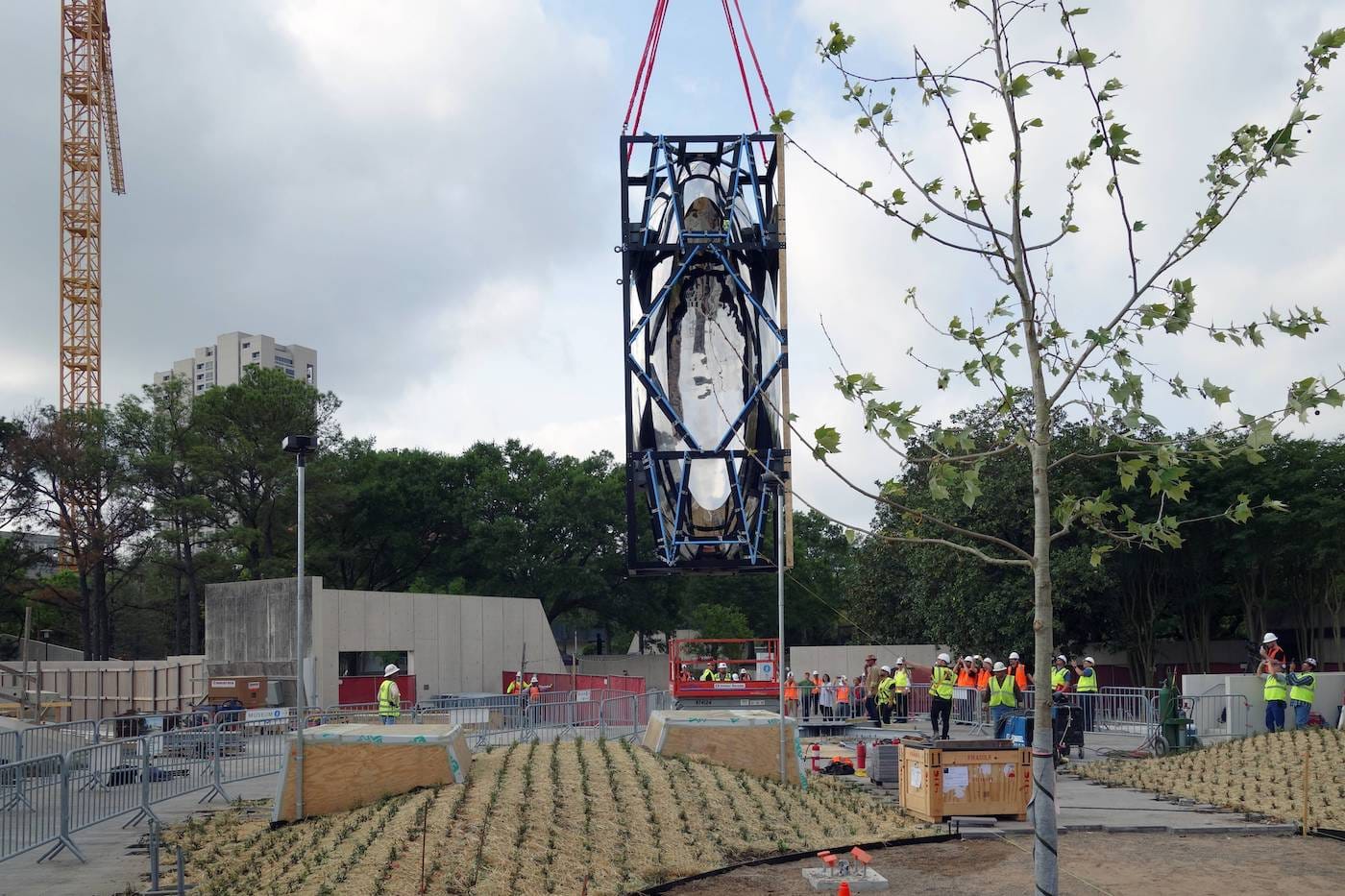Monday not only marked the end of the sculpture’s two-day-long installation but also the long-awaited completion of a vision that was once put on hold. “Cloud Column” was originally commissioned for the British Museum, but the project fell through. Unfinished, the sculpture resided in Kapoor’s London studio for years, and the artist went on to realize other works including “Cloud Gate.” Kapoor later received funds from benefactors to complete it, and MFAH decided to acquired the sculpture about three years ago. It is one of many sculptures it has acquired as part of its ongoing campus expansion, and will no doubt serve as a distinctive and engaging city marker.