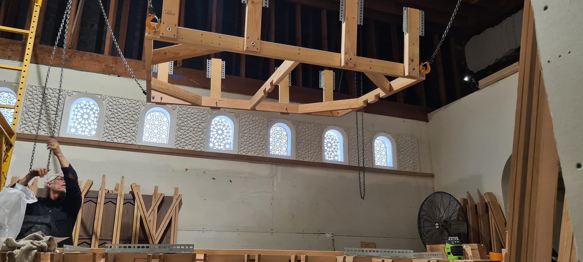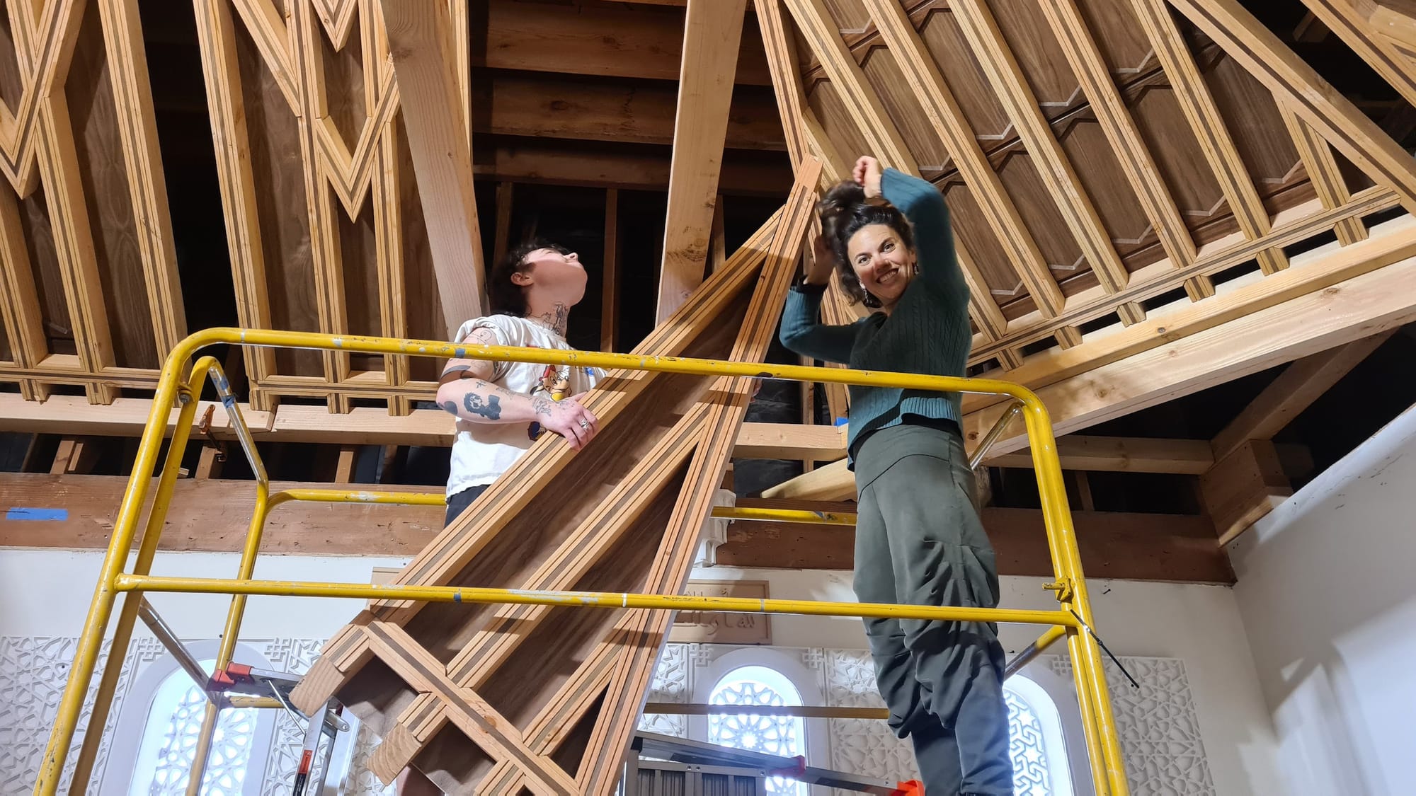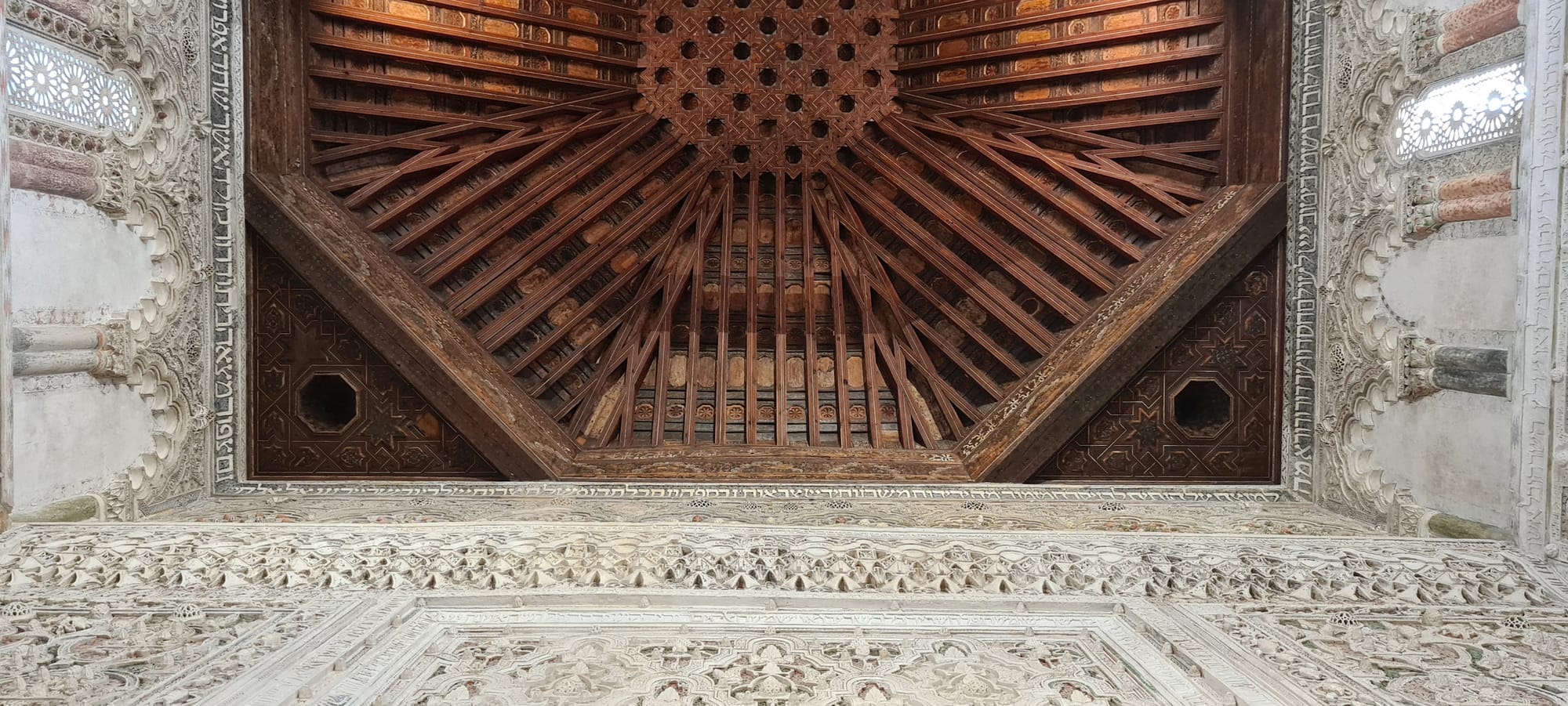 The grants funded trips to Spain to visit important examples of these forms, including the Alhambra. The museum also collaborated with artist Ángel María Martín, founder of Centro de Interpretación de la Carpintería Mudéjar in Ávila, who spent three weeks in LA in 2022 teaching Wilson and his team “how to make these crazy ceilings entirely out of wood,” Wilson said. After Martín left, the MJT crew was tasked with following his techniques, using traditional plaster and woodwork as well as 3-D printing to fabricate all the elements in their workshop, the largest of which is a lacería ceiling that measures roughly 22 by 15 feet.