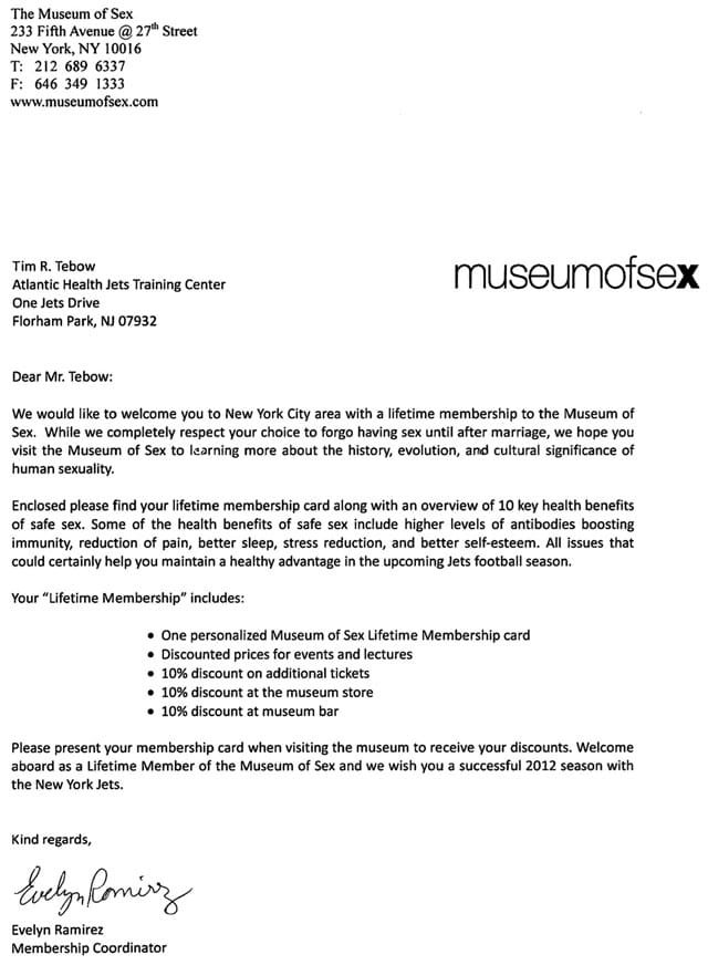 Sure, it’s probably just a publicity stunt but we love the idea that the Museum of Sex in New York is offering a lifetime membership to infamously virgin football player Tim Tebow.