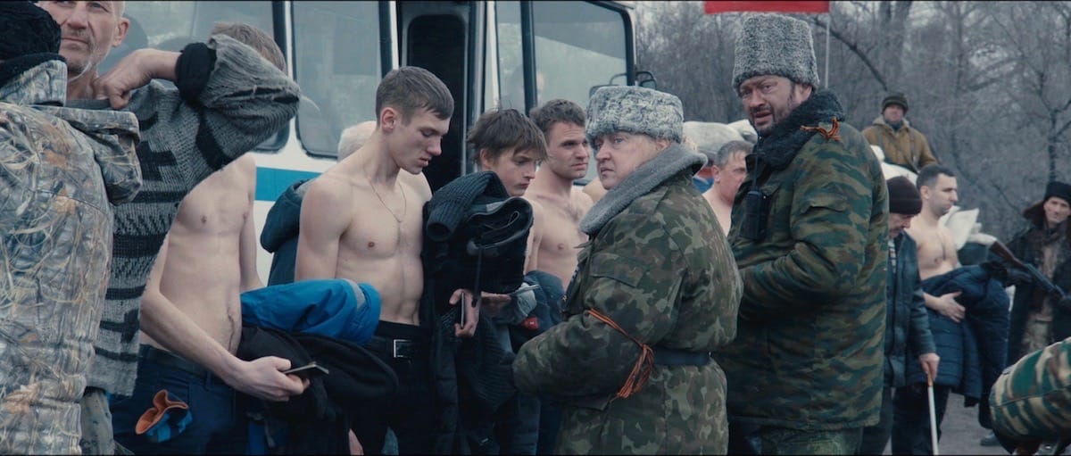 Distortion is a key theme in Donbass (2018), a roundelay of rage set in that titular region of eastern Ukraine scarred by the five-years-and-counting conflict between Ukrainians and pro-Russian seperatists. The film opens with a group of haggard actors preparing in a trailer and then trotted out to the scene of a wrecked tram by soldiers and wranglers, where they act as bystanders and witnesses, even giving TV interviews to reporters on the scene. “It all seems unreal,” a lady “eyewitness” tells the camera crew. Elsewhere, people get out their phones to take selfies and record videos of a Ukrainian soldier being publicly beaten. And in a later scene, a man with a deer-in-the-headlights look shows an obliging camera around a dank, dark subterranean bomb shelter full of people. The film is full of these episodes — seguing into each other, such as a person in a scene initially appears in the following one before dropping out of the film completely in this protagonist-less work. At first it hints at, then bursts with violence, wave after wave, which are recorded, disseminated, and manipulated for ideological gain for the separatists.