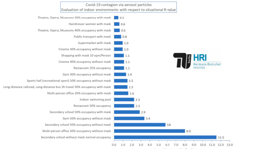 The study, led by Martin Kriegel and Anne Hartmann, conducted a comparative evaluation of indoor environments to assess the risk of infection via aerosol particles. The analysis considers the average length of stay in a given space (two hours at a museum; eight hours in an office; one hour in a supermarket; etc.), the quality of the airflow, the type of activity carried out in the space, and the dose of aerosol particles inhaled by people in a room, among other variables. Each environment has been given an R-value, indicating the number of people that one COVID-19 carrier can infect on average.