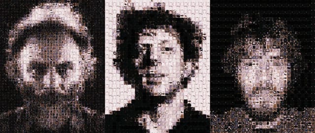 Once I have all the tiles separated into individual files, I use an action script that arranges the blocks into any image I want. This automatic process took me six months to figure out. To make the portrait my own, I use the magic wand tool in Photoshop, which allows me to select a single shade of gray and then replace the pixels with my designer tiles.