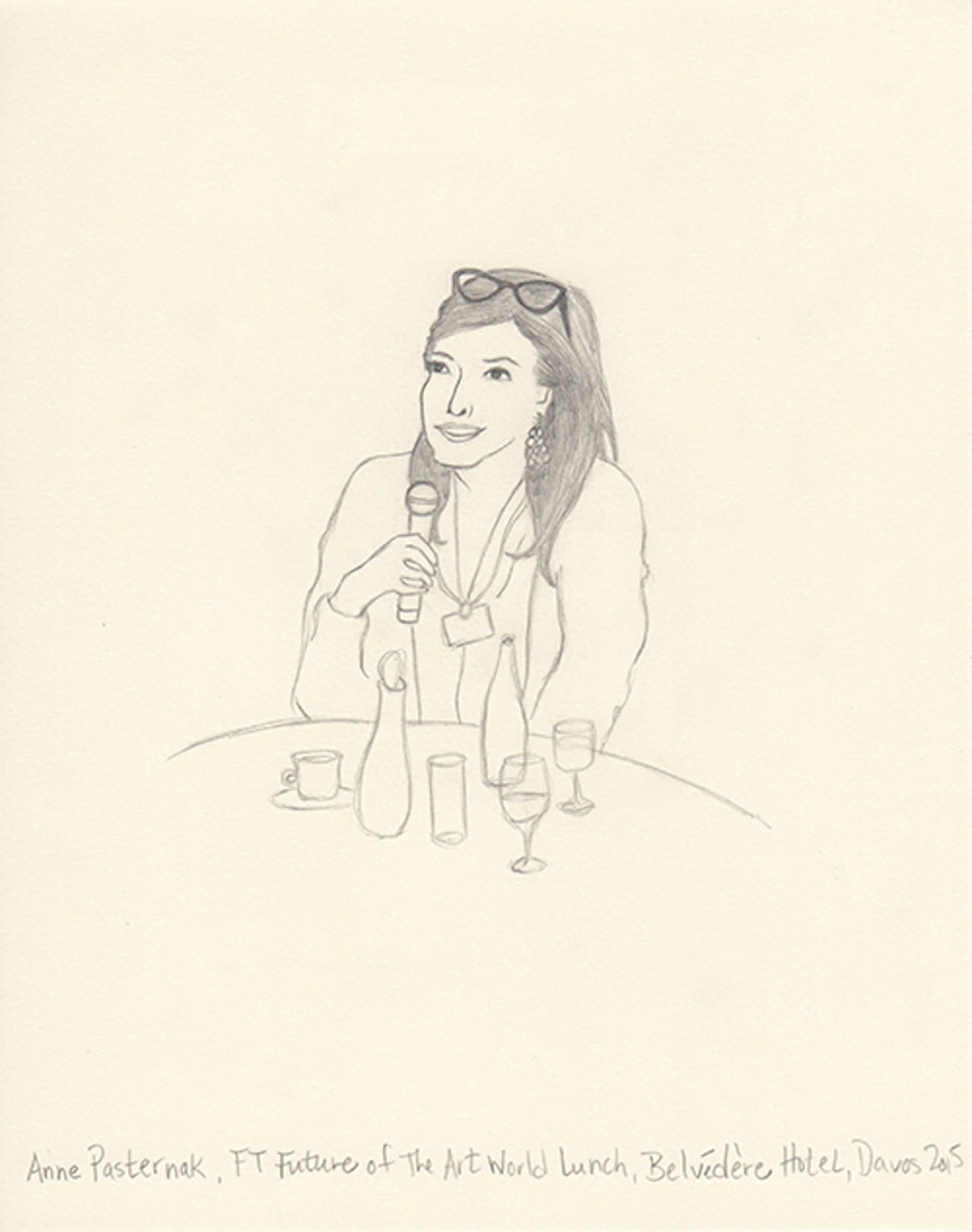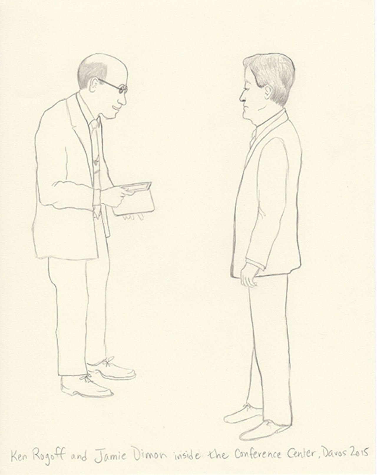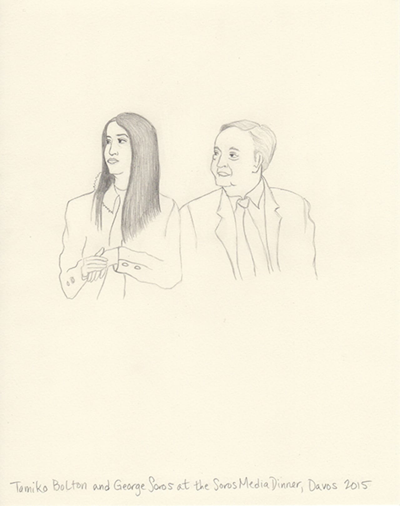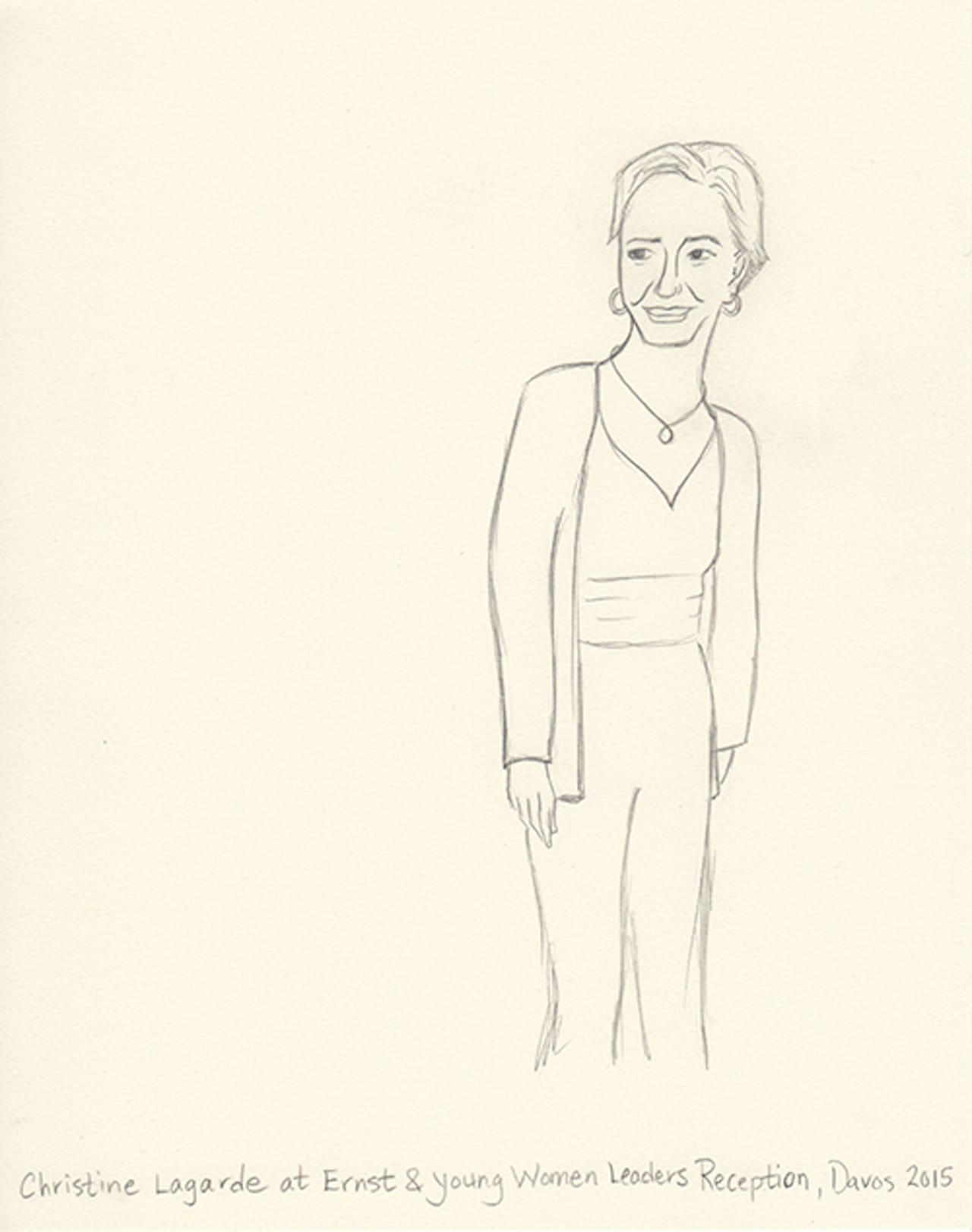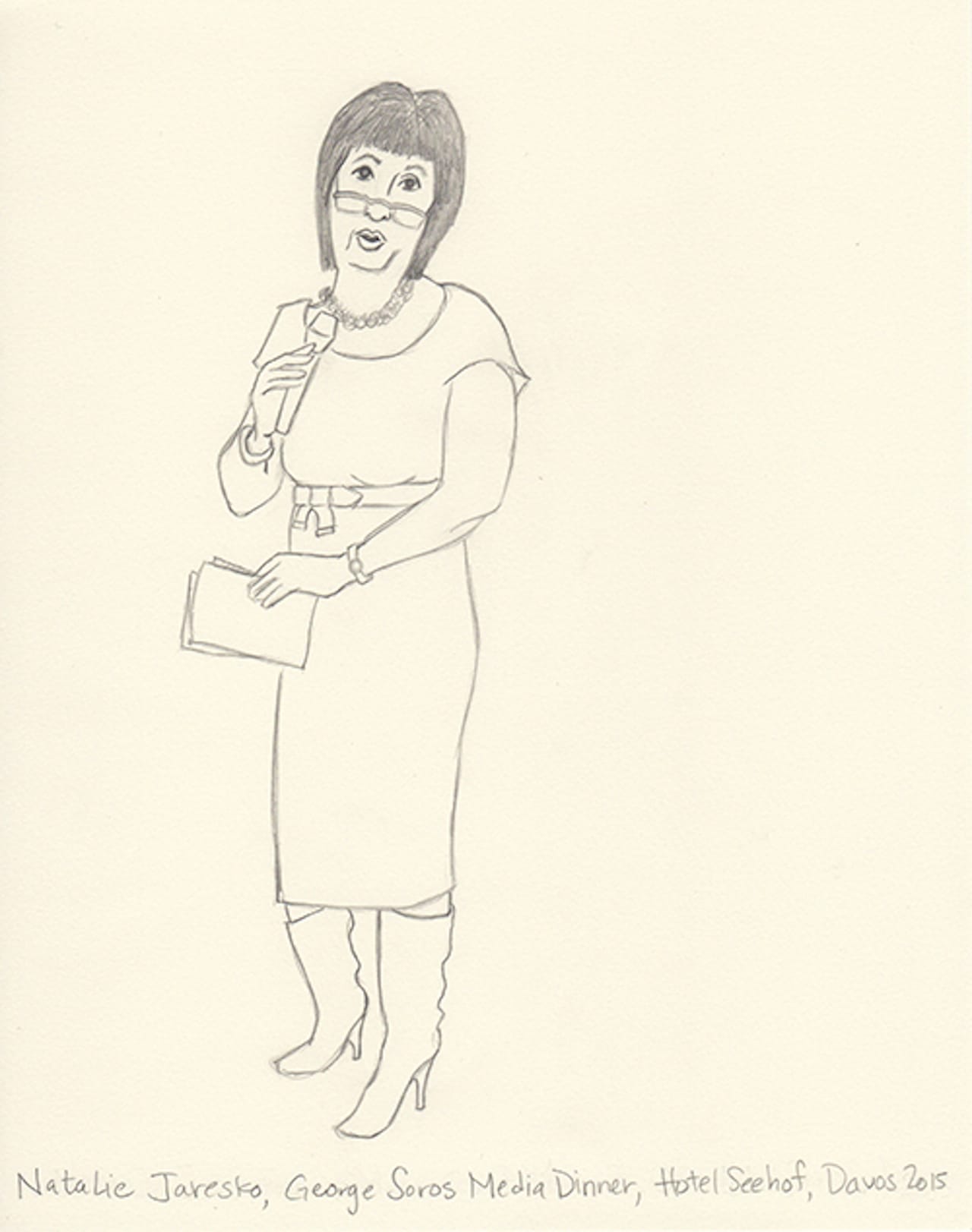 This year I decided to make drawings from an invisible person’s point of view. I’m not a sketch artist, nor am I a cartoonist. But I thought I’d try to capture in pencil the people I experience. I shot photos on my iPhone and then blew them up on my iPad. Then, back at the hotel, I sketched what I captured. Some are from talks, others are from parties. One night my husband and I ducked into a Women Leaders drinks reception and Christine Lagarde was casually socializing and posing for fan photos. Another evening we attended a George Soros dinner in which Natalie Jaresko (the finance minister of Ukraine) stood up from her meal to speak about the crisis there. I cannot imagine being finance minister of Ukraine right now.