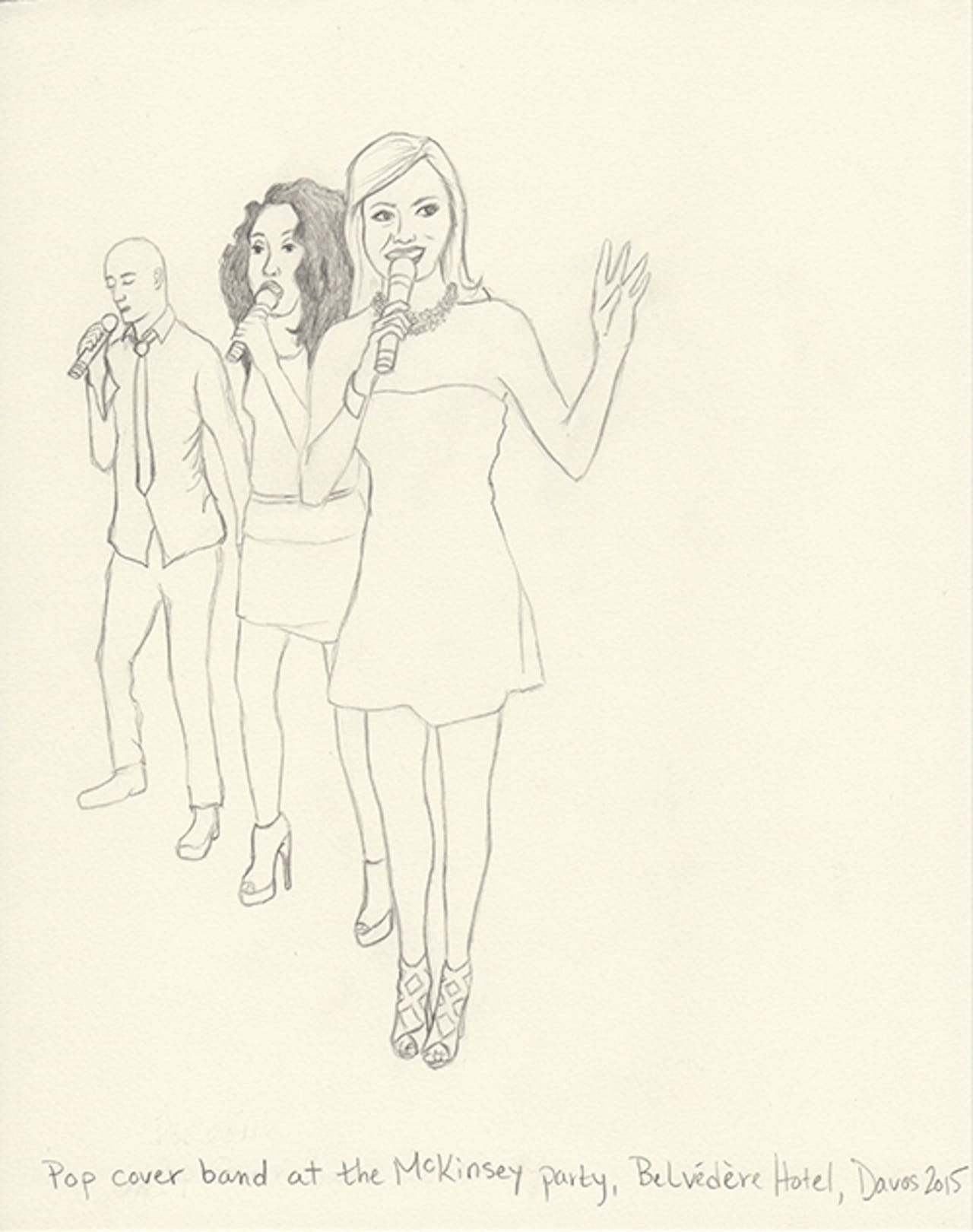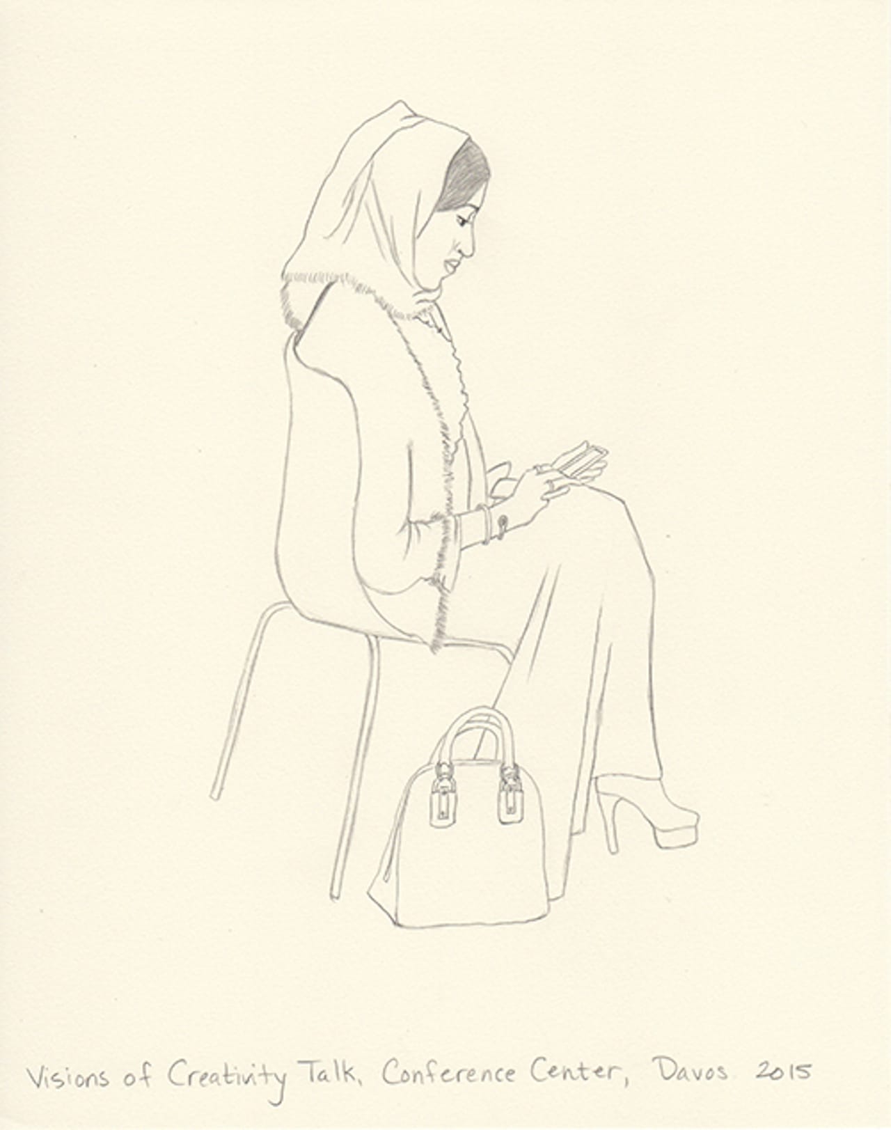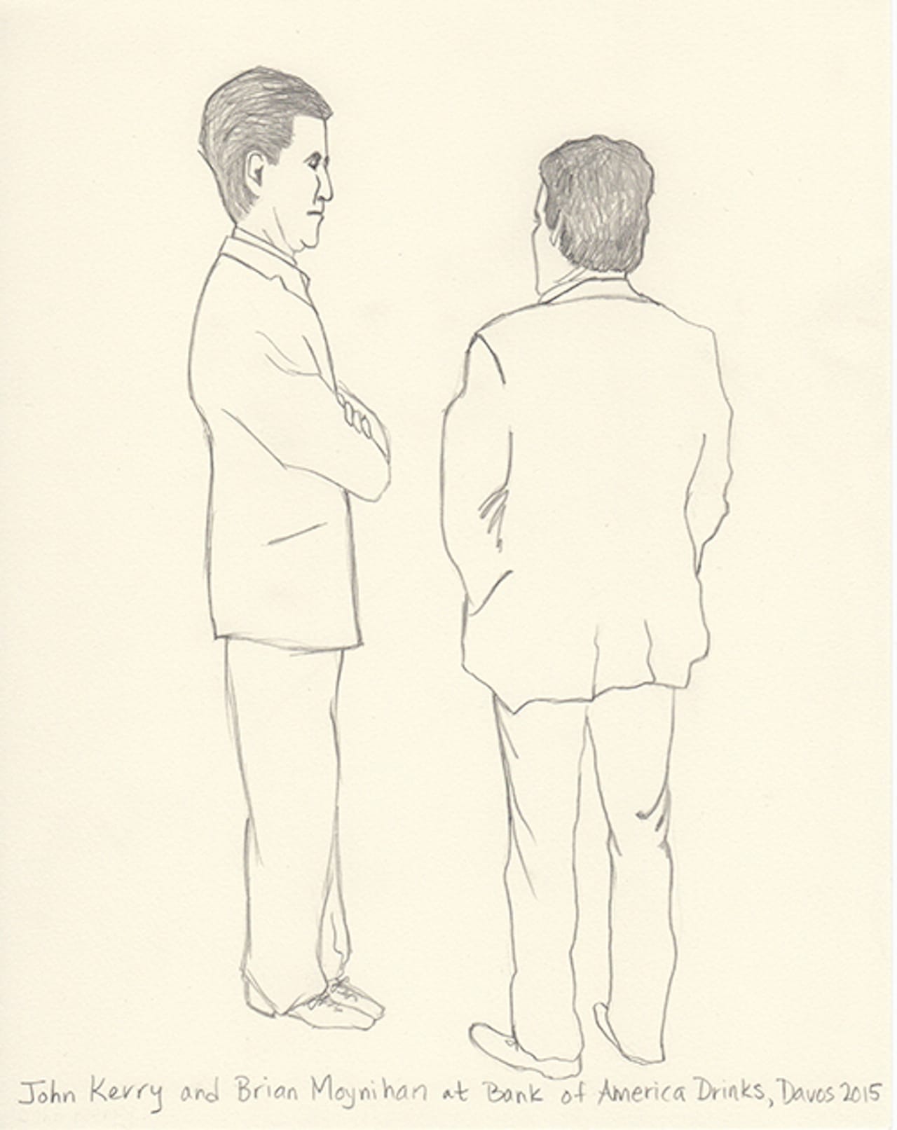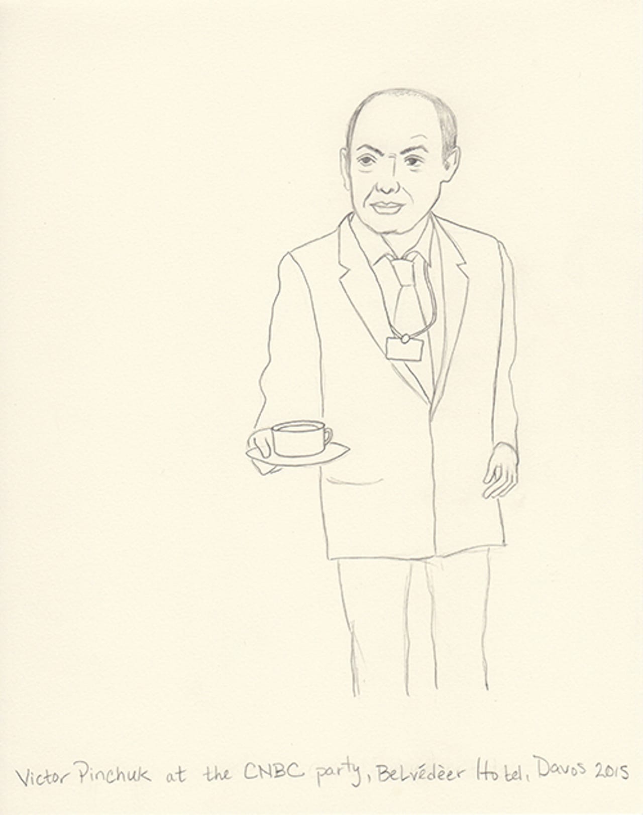This year I decided to make drawings from an invisible person’s point of view. I’m not a sketch artist, nor am I a cartoonist. But I thought I’d try to capture in pencil the people I experience. I shot photos on my iPhone and then blew them up on my iPad. Then, back at the hotel, I sketched what I captured. Some are from talks, others are from parties. One night my husband and I ducked into a Women Leaders drinks reception and Christine Lagarde was casually socializing and posing for fan photos. Another evening we attended a George Soros dinner in which Natalie Jaresko (the finance minister of Ukraine) stood up from her meal to speak about the crisis there. I cannot imagine being finance minister of Ukraine right now.