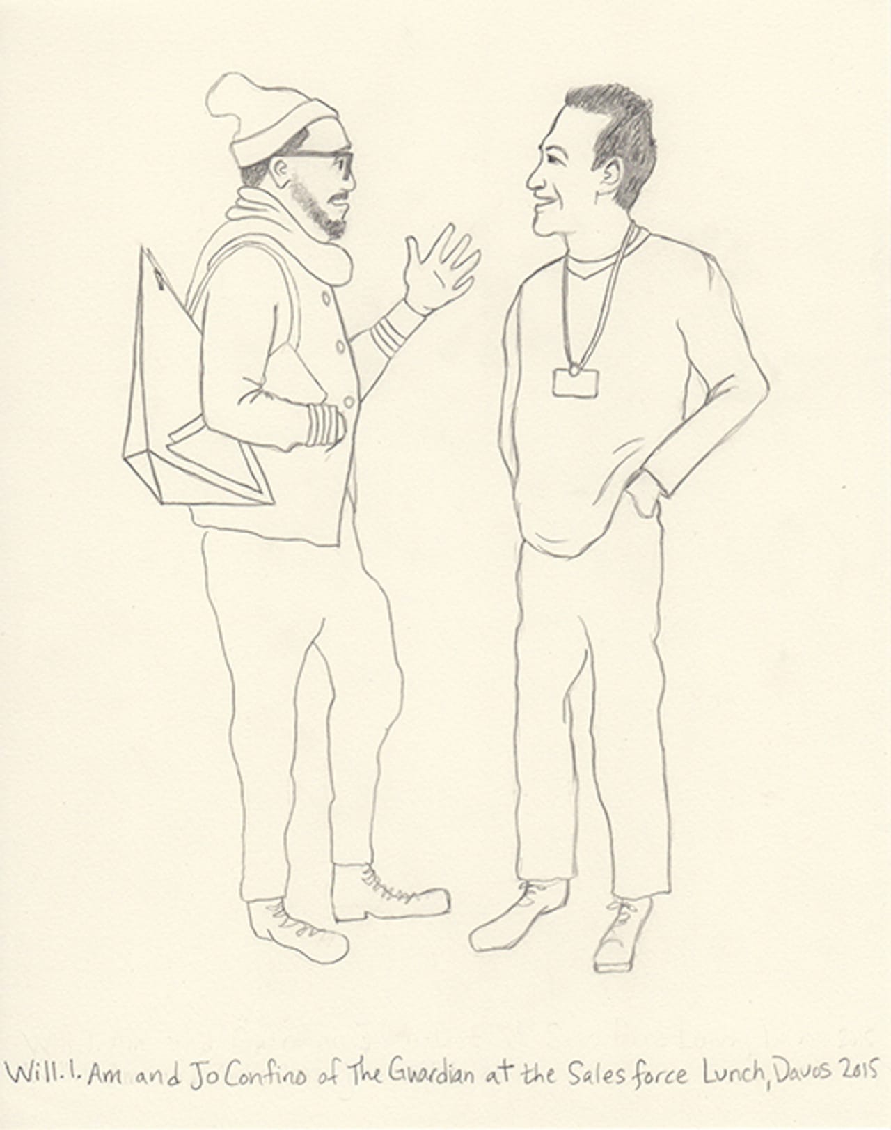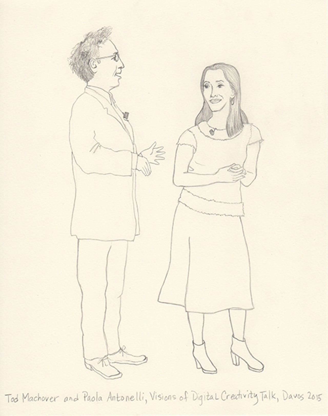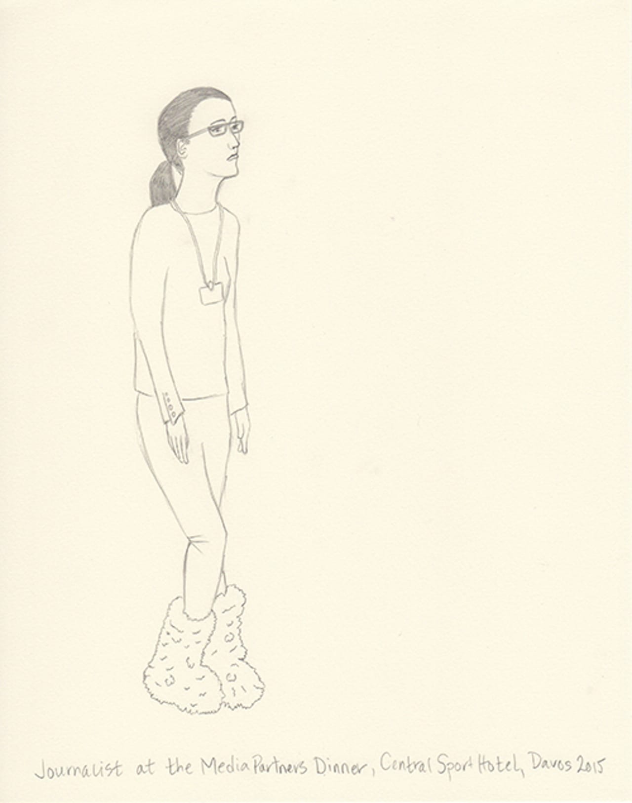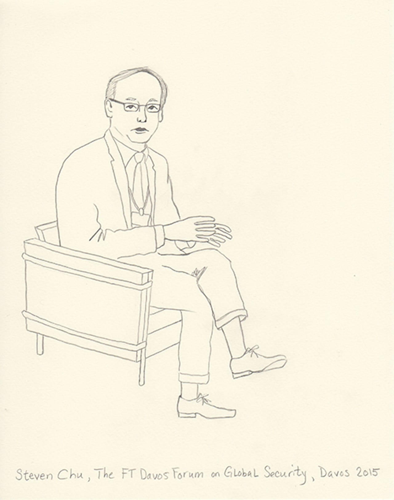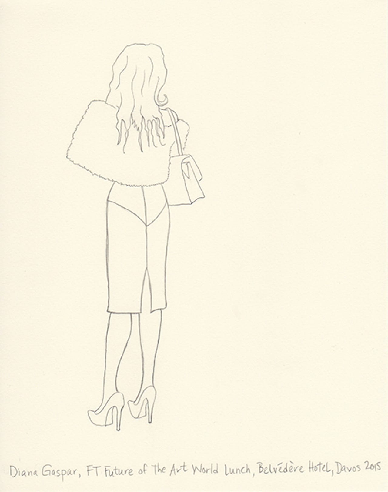 This year I decided to make drawings from an invisible person’s point of view. I’m not a sketch artist, nor am I a cartoonist. But I thought I’d try to capture in pencil the people I experience. I shot photos on my iPhone and then blew them up on my iPad. Then, back at the hotel, I sketched what I captured. Some are from talks, others are from parties. One night my husband and I ducked into a Women Leaders drinks reception and Christine Lagarde was casually socializing and posing for fan photos. Another evening we attended a George Soros dinner in which Natalie Jaresko (the finance minister of Ukraine) stood up from her meal to speak about the crisis there. I cannot imagine being finance minister of Ukraine right now.