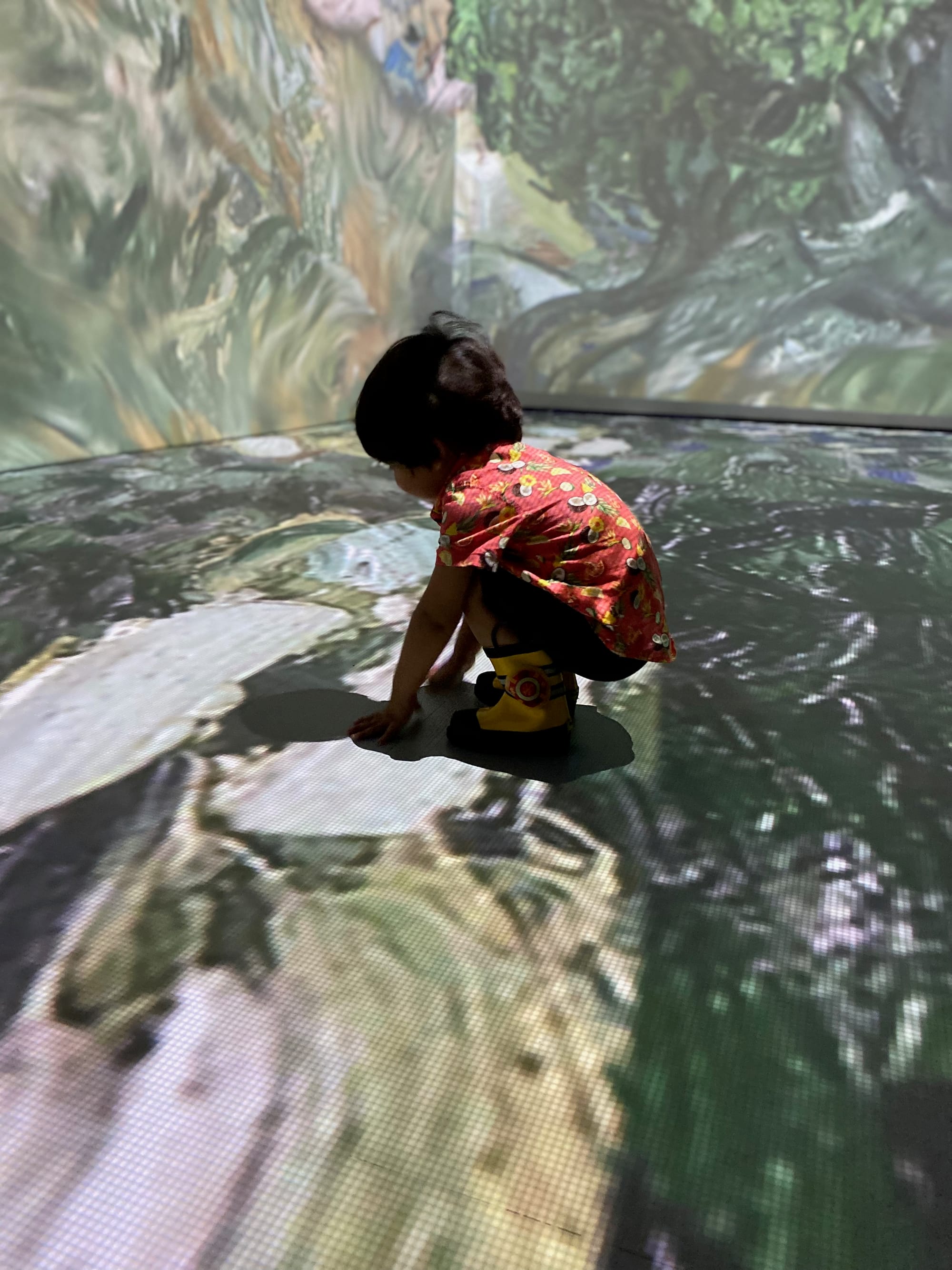 Once you are within the exhibition itself, however, the magic starts. We stumbled in as “Almond Blossoms” (1890) started its growth cycle, and after about two minutes of acclimatization, the kids were entranced, as (for shame) was I. The two-year-old was, well, two. He tried to catch the paint chunks that flickered on the floor, and, having recently learned “twinkle twinkle little star” was naturally delighted by “Starry Night” (1899). The four-year-old, on the other hand, had been prepped by her dad in advance, and had deeper questions, such as “How can we be in the picture?” and, in response to the projection up-swoop of “Café Terrace At Night” (1988), “Why are we in an elevator?” This was as good a chance as any to talk about depth and perspective. Eventually, there was just looking: looking at art coming to digital life.
