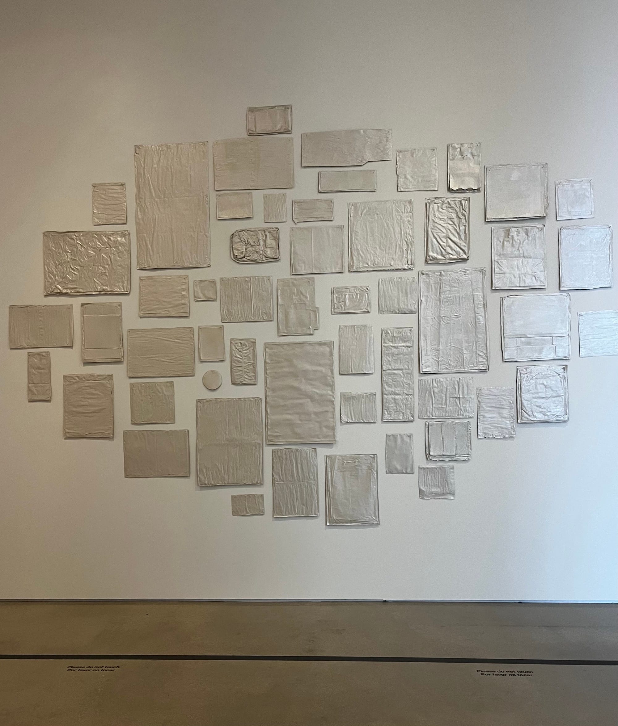 I shuffle alongside my friend. Every object makes me cower. We drift into a new room. One wall holds an array of rectangular shapes covered in silver. I don’t recognize the artist, but I pause. The shapes are actually mailers and found packaging. The humble veneered materials feel like an antidote to the thousands of over-intentional objects colored with disappointment that have populated my week. I’m not sure why I find such pleasure in this. Maybe it is the layering of waste and wonder (discarded mailers, silver sheen), or perhaps this piece by Mexico City-based artist Abraham Cruzvillegas makes the portent of transformation tactile, while also holding firm to bits of the world or one’s path through it. At the museum, in front of his piece, I feel my spirit re-enter my body, as if I had lost myself, then tenderly found a bit of it again, in this forest called the art world.