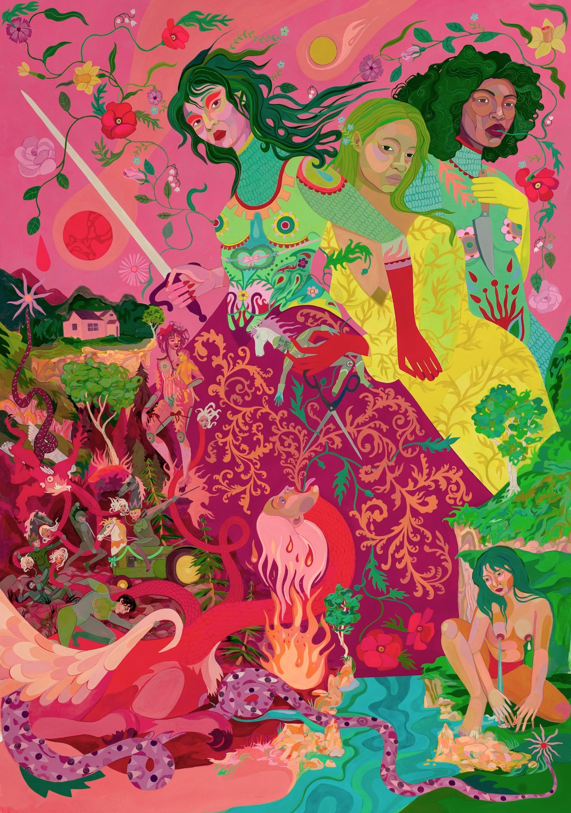 Everyone said that Saturday and Sunday would be better at the fair. Saturday passed, with one small sale. Sunday, the final day, slid quietly through its five-hour, last-gasp promise. A couple comes in the booth and admires a six-by-four-foot canvas by a young midwestern artist. As we did with hundreds of people before them, we chat, exchanging observations about the work. The painting of three giant women armed with swords in a Medieval fantasy land reminds them of their own three daughters, and they buy it. It is our first five-figure sale of the fair. It will not get us to the break-even point, but it lessens the loss.