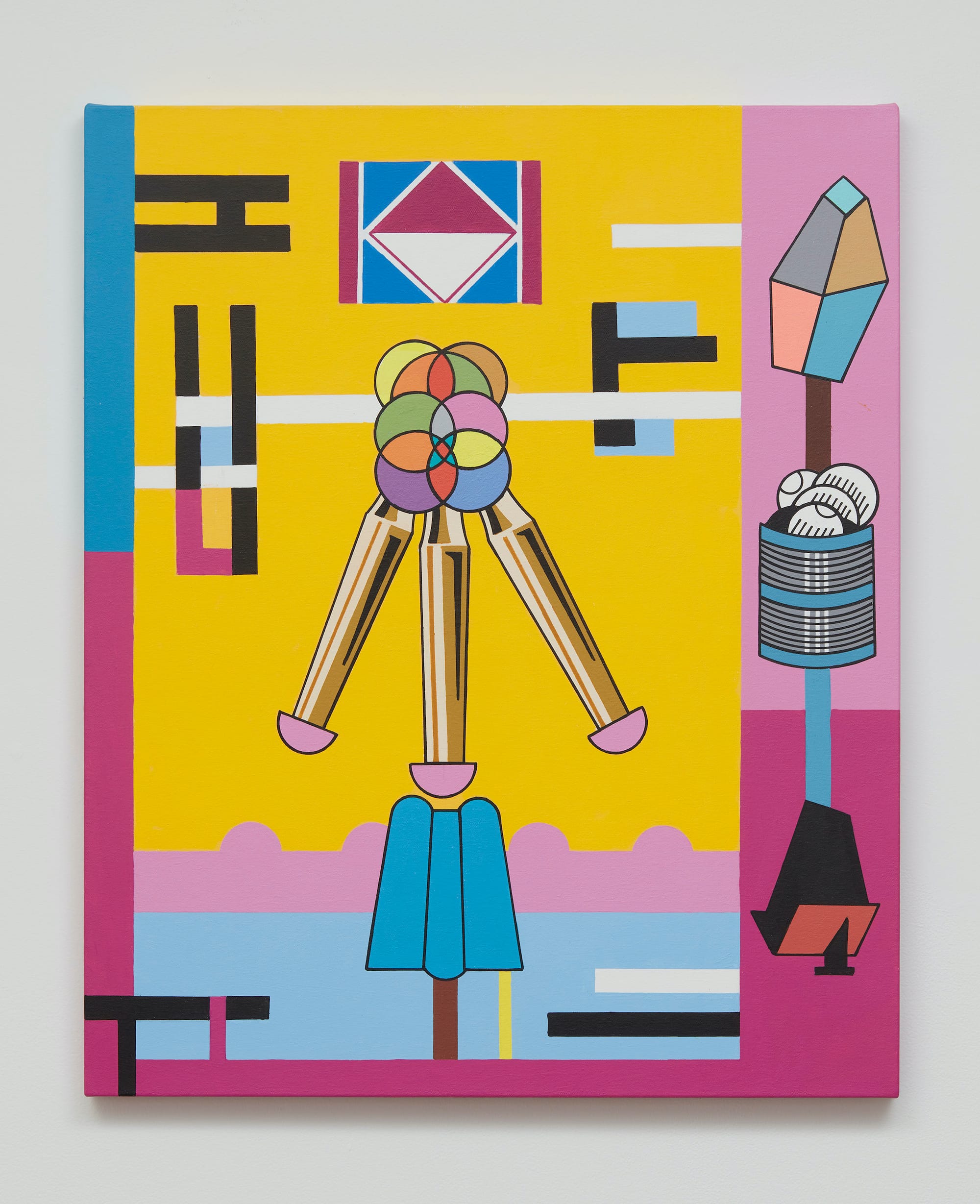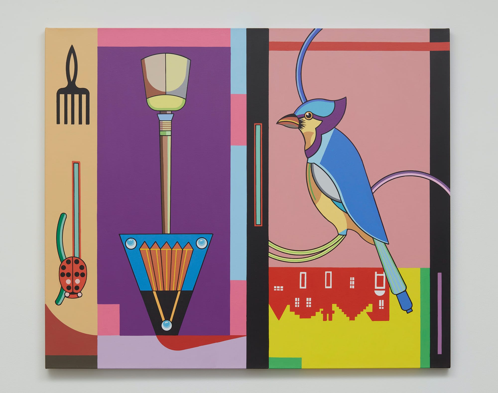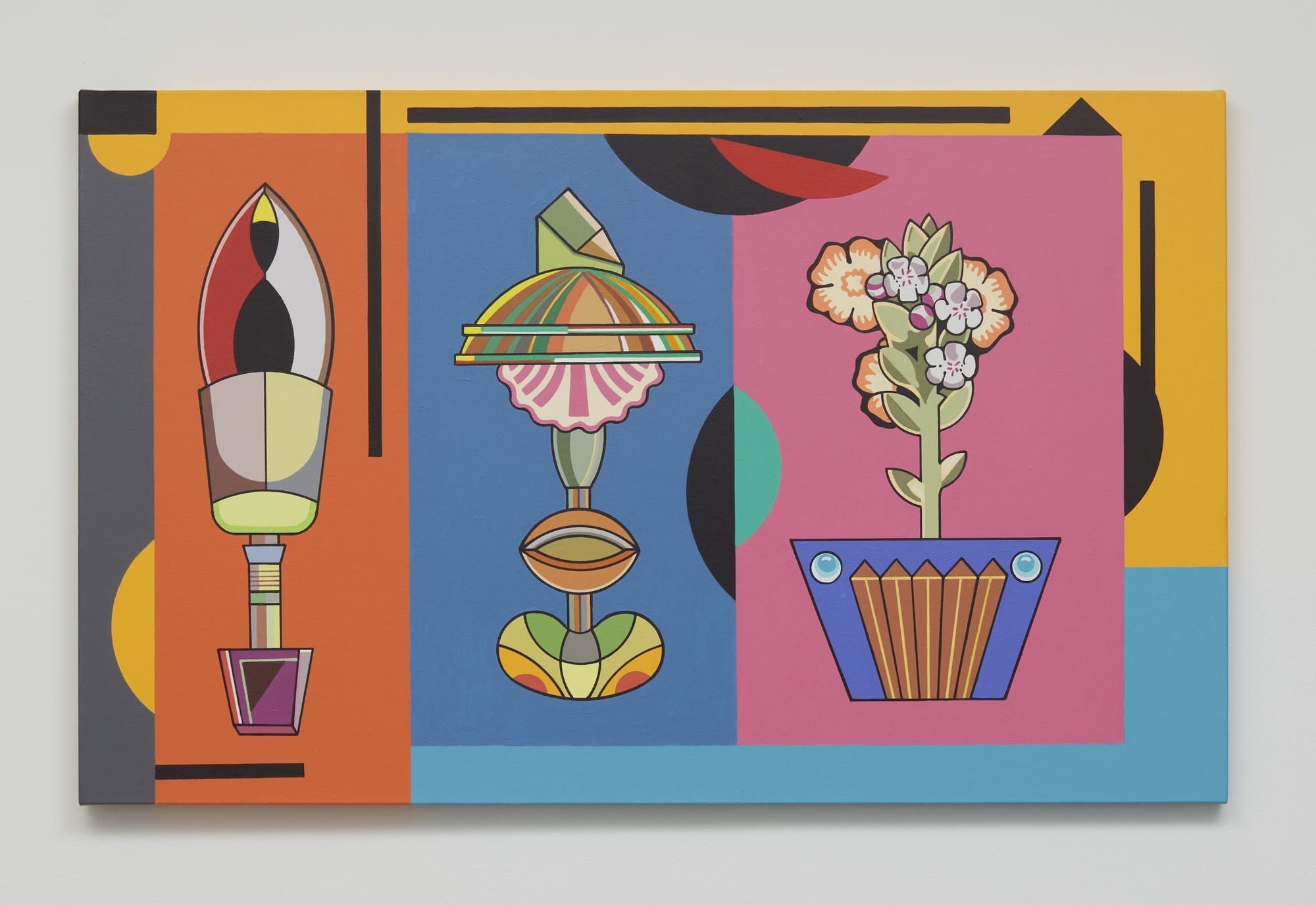 Consider the three stylized items in “Plant Wrongs” (2019), each occupying a different-colored rectangle. On the left is a light bulb shaped like a candle flame. In the middle is a flat, stylized version of a Victorian lamp, complete with a multicolored kidney bean base and fluted seashell below the lampshade. On the right, a flower rises out of a trapezoidal pot bearing stylized feathers like those in “The Guardian of the Broom Closet.” Does the combination of a modern light, a Victorian-era lamp, and a flower allude to the history of design, dating back to 19th-century England, or the relationship between plant forms and domestic items and architecture? Is the painting about the promiscuity of the imagination?