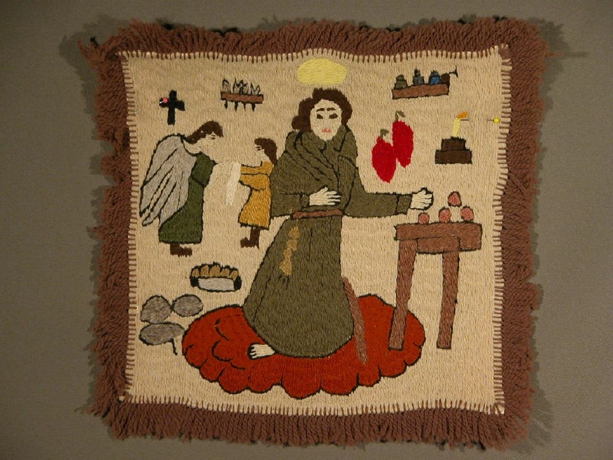 Adjacent rooms within the museum proudly displayed their collections: Native American and Hispanic jewelry, pottery, and other religious artwork, each with captions stating dates, locations, and origins. The lighting in each room and display was soft, inviting. A bowl created at Santa Clara Pueblo. A retablo depicting San Juan and San Isidro.