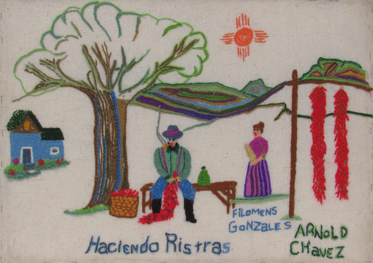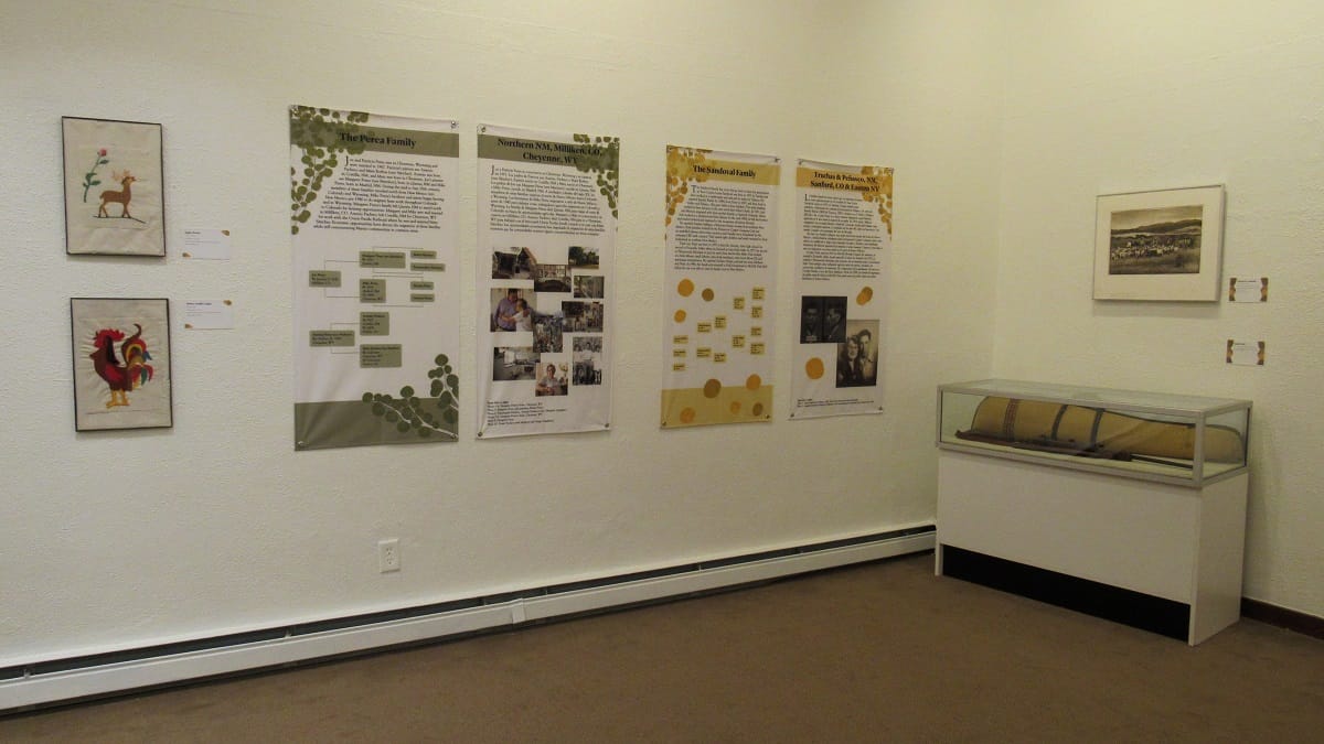 Accompanying each of the exhibition's banners were also objects such as a family rifle complete with canvas case, a Spanish colonial traveling trunk, a 19th-century kettle of iron and wood, and a colcha with wool on wool embroidery and natural dyes. While these objects were visually stunning and spoke to the past, only one was an object from the Manito familias featured in the exhibition.