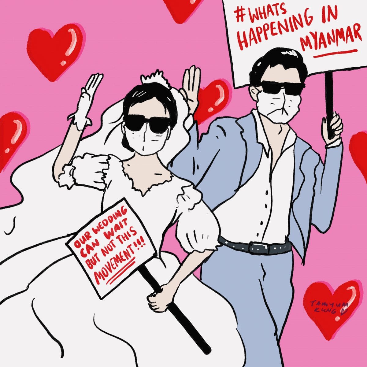 The protestors in Myanmar have been inspired by the pro-democracy movements in Hong Kong (2019–now) and Thailand (2020–now), where protestors have also capitalized on new, expressive methods made possible by the digital age. Through these connections, they have affiliated themselves with the “Milk Tea Alliance”: an expression of cross-border solidarity in fear of China’s authoritarianism, uniting like-minded netizens in Thailand, Hong Kong, Taiwan, Myanmar, and beyond. The online campaign started in April 2020 after a Thai-Chinese meme war on Twitter, when a Thai actor and his girlfriend were accused of supporting democracy in Hong Kong and Taiwanese independence. Protestors from each of the four countries have shown support for each other’s cause, for example through the creation of “solidarity protest art.” Recent viral use of the accompanying hashtag even had Twitter creating a special emoji for the Milk Tea Alliance, lending greater credibility to the movement and stimulating global recognition and support. The three-fingered salute, popularized by the Hunger Games film series, has become their shared signal of resistance, symbolizing the demand for equality, freedom and democracy. As a result, it has become a common theme both in online and in-person protest art.