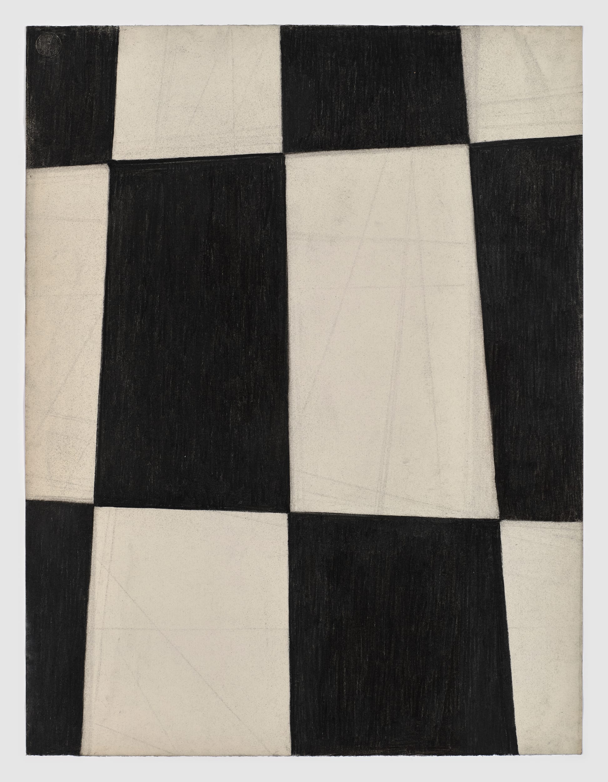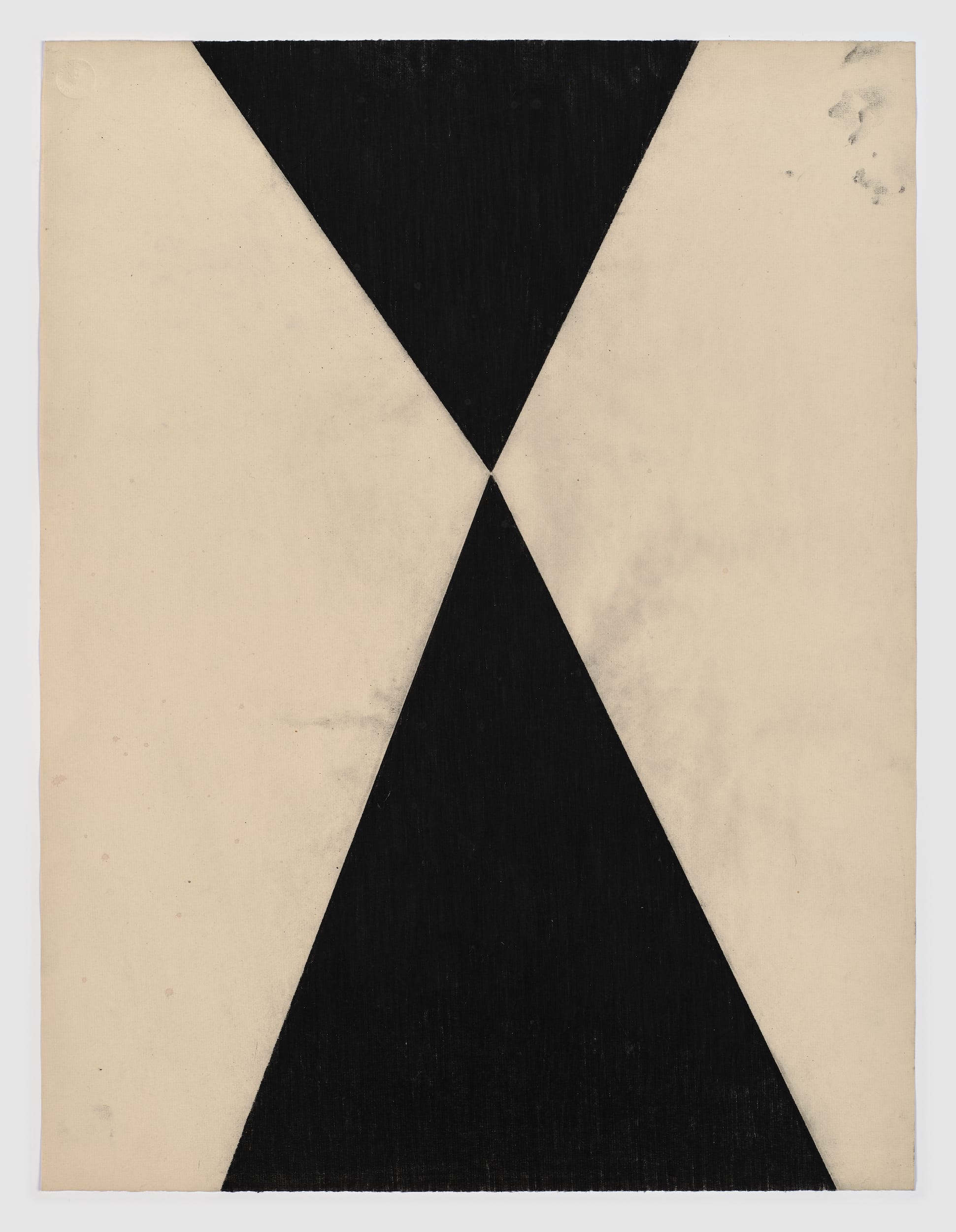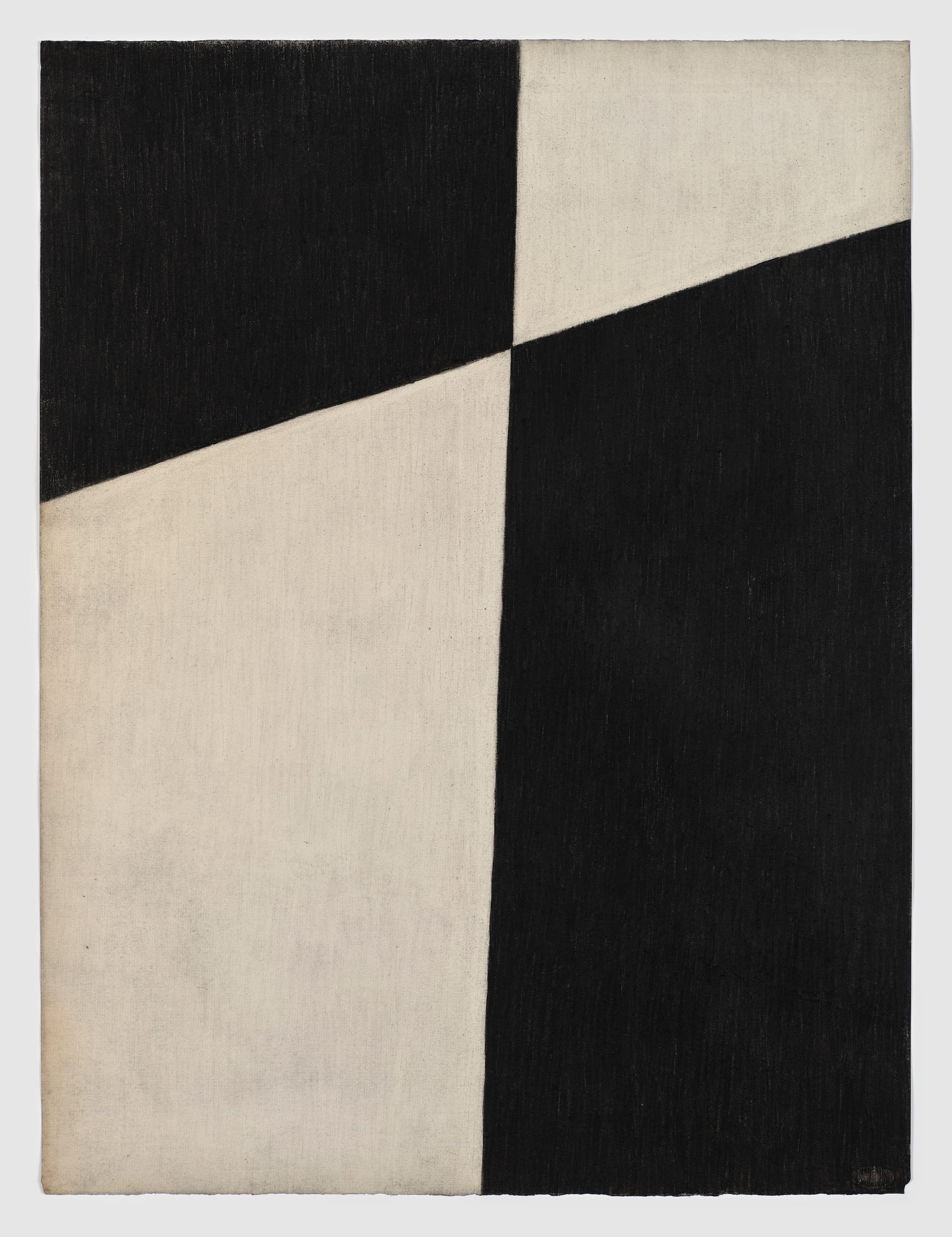 The period from 1946 to ’53, in which Stout made these drawings, overlaps with the breakthroughs of Clyfford Still and Jackson Pollock and the rise of what Clement Greenberg characterized as “American-Type Painting.” From the beginning, Stout was an outlier. He started off by making cubistic figure studies in Hofmann’s class, which had none of the muscular linearity we find in the charcoal drawings of other students, such as Lee Krasner and Paul Resika. Once he began making geometric black and white works, he sought to create a sharp tension between the paper’s flat plane and containing edges and the diagonal arrangement of the black and white rectangles. His blacks range in density from sooty to ashy, a result of controlling the pressure.