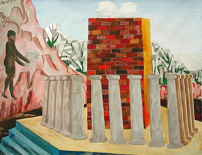 In Garabedian’s take on mythology’s exemplar of pointless labor, Sisyphus is shoved all the way to the left edge of the painting, an anonymous figure rendered in penumbral tones of muddy brown and moss green. He isn’t rolling a rock but holding it aloft, as light as a hunk of Styrofoam. To his right, and taking up most of the composition, is a plinth built of bricks and surrounded by classical columns, which stand atop a stepped platform, like an altar. A pink, rocky outcropping, where Sisyphus can be found engaging in his labor (whatever it might be) rises on the left, while directly behind the plinth Garabedian has made a mountain ridge from scraps of reflective metal foil, a silvery shimmer against the milky blue sky.