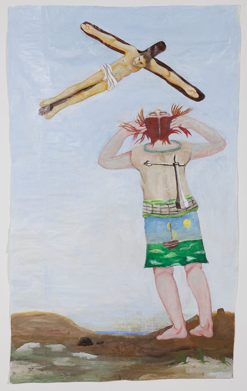 “Stigmata” (2014) is the most recent and perhaps the oddest of the three: it is dominated by the figure of a woman, her back turned, her head thrown back, her fingers dug deeply into her hennaed locks as she stares skyward at the crucified Jesus hovering above her like a helicopter. It is a motif usually associated with depictions of St. Francis, holding out his hands in supplication as they are pierced with holes mimicking Christ’s wounds.