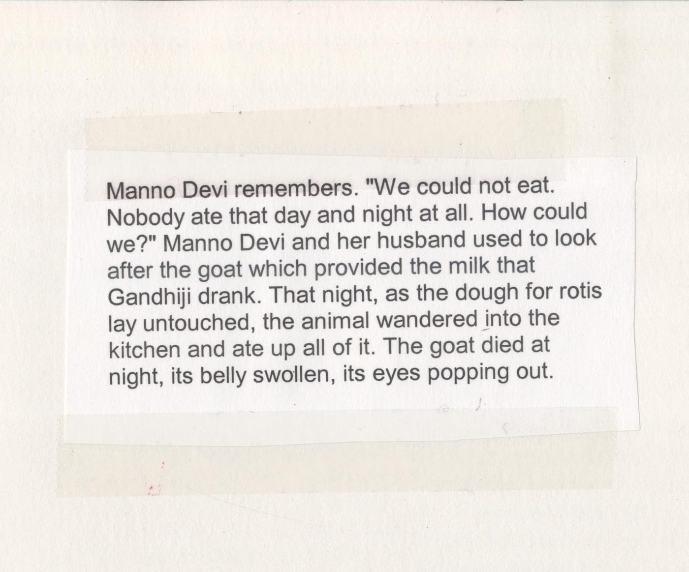 I grew up in India hearing about Mahatma Gandhi and when I think about myths it is his bald, bespectacled head that comes to mind. This is not to suggest that Gandhi, a bamboo staff in hand, stands at the mouth of the dark cave where all falsehood is stored. No, what I want to convey is my early sense that there are people and events that achieve a certain fictionality. Stories become attached to them. As a writer, this aspect of life is of great interest to me. What is even more fascinating is the way in which other stories take root in the shadow of the mythical figure. Here’s a fragment from a report that I read in a magazine about the aftermath of Gandhi’s assassination on January 30, 1948. It is a story that is so good that I haven’t tried very hard to find out whether it is true or not; when I first read this account 15 or 20 years ago, I copied and pasted it in the pages of my writing journal: