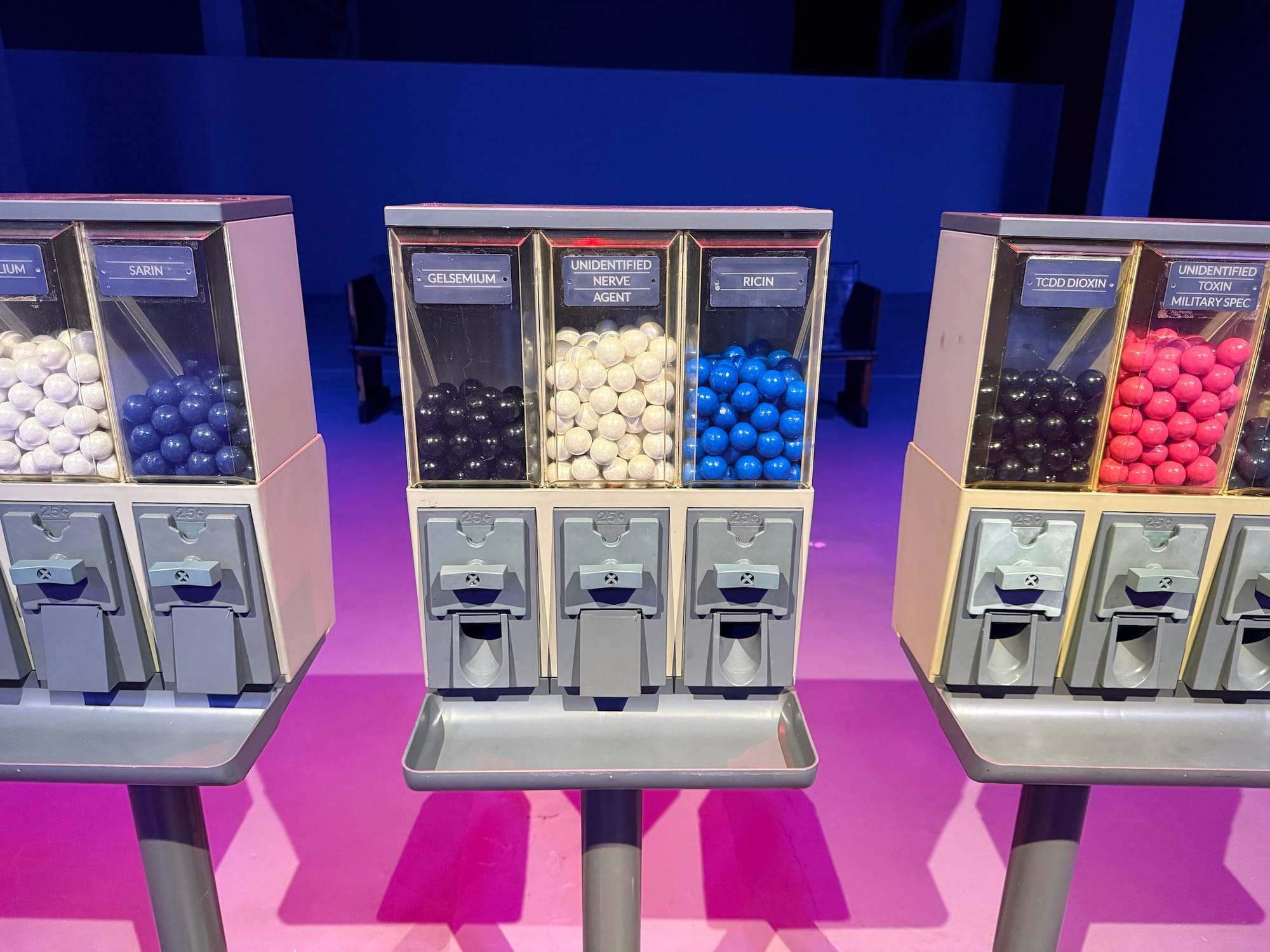 On one side of the cell, gumball machines filled with colorful balls bear the names of poisons commonly used by the Russian government to silence critics, including Russian opposition activist Alexei Navalny, a friend and mentor to Tolokonnikova, who died in prison last year while serving a 19-year sentence. The machines are flanked by two of her “icon” paintings, which combine Cyrillic calligraphy with stylized depictions of female faces, sometimes wearing Pussy Riot’s signature balaclavas. Banners bearing the slogan “Punk’s Not Dead” — the title of a recent two-part exhibition at Honor Fraser Gallery — flutter in front of fans.