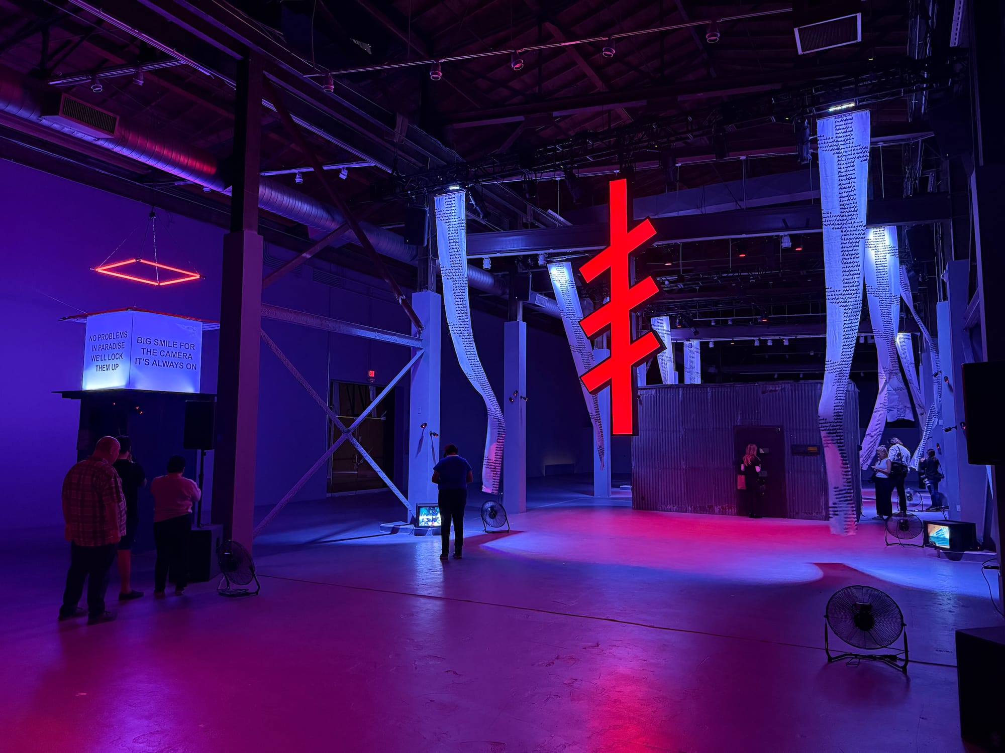 At MOCA, the cell is placed in the center of the warehouse, as a replica guard tower stands watch, its glowing top bearing text reading “Big Smile for the Camera / It’s Always On” and “No Problems in Paradise / We’ll Lock Them Up.” Video plays on two monitors: one featuring video taken inside Russian prisons, another streaming footage from four security cameras placed inside the cell.