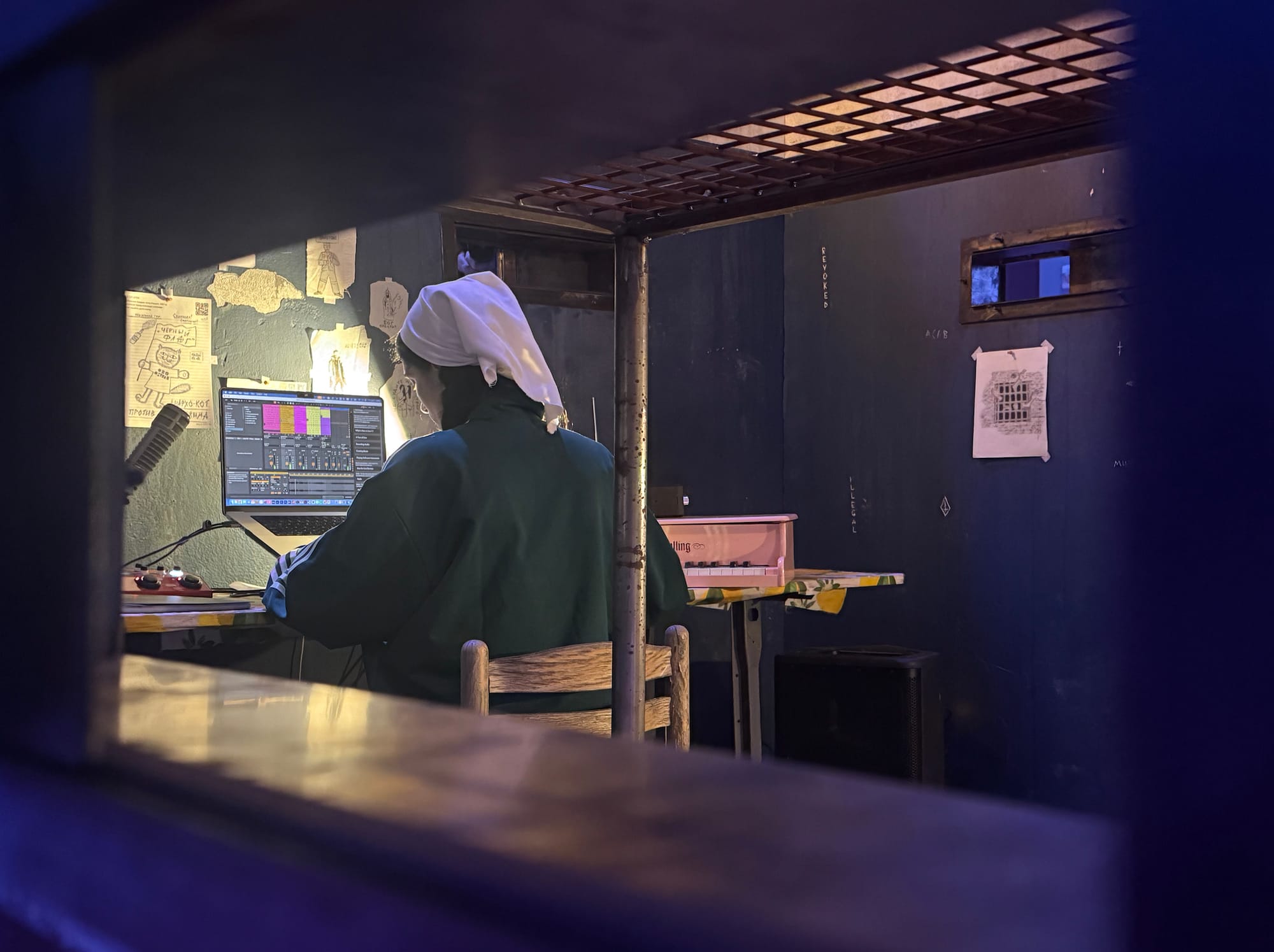 Since last Thursday, June 5, Tolokonnikova has occupied a recreation of a drab, Russian prison cell during the museum’s open hours, and will continue to do so through this Saturday, June 14. Through small peepholes in the corrugated metal structure, the public can watch as she creates soundscapes that echo through the space, remixing various sources including recordings from actual prisons, a live LA Police scanner feed, and her own heartbeat, filtered through a heart-monitor synth fabricated by collaborator Riley Bray.